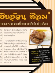 “หมูปิ้งเฮียอ้วน สีลม" ร้านนี้เป็นร้านเก่าแก่ของบรรดาคนเที่ยวกลางคืนในย่านสีลม เปิดขายมาทั้งหมดกี่ปีนั้นไม่แน่ใจ ปริมาณคนที่เข้าคิวรอในแต่ละคืนมีไม่ เฮียจะเข็นรถออกมาเปิดร้านขายตั้งแต่ น้อยเลยทีเดียว จนเราอดไม่ได้ที่จะต้อง ประมาณสี่ทุ่มครึ่งเป็นต้นไป (ข่าวมาว่า ที่ ลองต่อคิวซื้อดูบ้าง เป็นเวลานี้เพราะเฮียแกติดละครหลังข่าว ฮา!!) หลายคนนิยมทานหมูปิ้งเป็นมื้อเช้า และแล้วก็ไม่ผิดหวังจริงๆ เพราะหมู เพราะหาซื้อได้ง่ายและสะดวกในการพก ปิ้งพี่อ้วนเค้าทั้งนุ่มและอร่อยเด็ด มีที่มา พาไปทานต่อในที่ท�างาน หากแต่หมูปิ้งพี่ จากซอสหมักหมูปิ้งที่พี่อ้วนปรุงขึ้นมาเอง อ้วนเจ้านี้กลับสวนกระแสออกขายยาม ด้วยสูตรเฉพาะพิเศษ หมักไว้ข้ามคืนให้ ค�่าคืนในเวลาที่ผู้คนก�าลังพลุกพล่านโดย เข้าเนื้อ แล้วน�ามาปิ้งให้สุกแบบพอดี ไม่ เมนูแนะน�ำ : ข้ำวเหนียวหมูปิ้ง เฉพาะอย่างยิ่งในย่านถนนสีลมแห่งนี้ แม้ แห้งจนเกินไป มีมันเล็กๆ สลับกับเนื้อหมู เวลำท�ำกำร : 22.30 – 03.00 ย่ำน : หน้ำเซเว่น จะเป็นเพียงหนึ่งในรถเข็นขายหมูปิ้งที่ดู และจิ้มน�้าจิ้มรสชาติ เปรี้ยว หวาน เผ็ด ปำกซอยคอนเวนท์ สีลม ไม่แตกต่างจากคันไหนๆ แต่หมูปิ้งของพี่ ยิ่งกินกับข้าวเหนียวร้อนๆ พระเจ้า อร่อย ประมำณรำคำ : 10 - 15 บำท เบอร์ติดต่อ: 083-999-6997 อ้วนกลับขายดีเป็นเทน�้าเทท่า ดูได้จาก เกินบรรยาย….