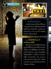 ภัยมืดที่ต้องระวัง สาวๆ จ๋า เมื่อหน้าฝนมาเยือนการเดินทางย่อมไม่สะดวกสบายเหมือนฤดูอื่นๆ แต่เรียก 1. เริ่มตั้งแต่ก่อนขึ้นรถ แท็กซี่ได้แล้วก็อย่างเพิ่งดีใจ อย่าเผอเรอนั่งสบายๆ ในแอร์ชุ่มช�่าจนลืมนึกถึงความปลอดภัย เวลาเปิดประตูบอกที่หมายให้สังเกต กันนะคะ Voice of babara ฉบับนี้ เรามี วิธีปฏิบัติตัวเมื่อต้องนั่งแท็กซี่คนเดียว มาฝากค่ะ ว่าในรถมีทะเบียนรถที่เป็นแผ่นเหล็กติด อยู่ที่บริเวณประตูหรือไม่ และสังเกตว่า คนขับหน้าตา ท่าทาง ดูน่าไว้วางใจหรือ ไม่ มีอาการมึนเมารึเปล่า 2. เมื่อขึ้นไปนั่งควรจ�ำ ทะเบียนรถทันที หรือจดใส่กระดาษไว้ ดูชื่อคนขับ และ 3. ถ้ำโดยสำรคนเดียว ดูรูปบัตรที่ติดในรถกับคนที่ขับว่าตรงกัน ควรเลือกนั่งเบำะหลังที่นั่งคนขับ หรือไม่ แต่จะให้ดีที่สุดควรโทรศัพท์หา โดยนั่งให้ชิดประตูเพราะจะท�าให้ คนที่ก�าลังจะไปหา แล้วบอกไปเลยดังๆ การพยายามท�าอันตราย ต่อผู้โดยสาร ให้คนขับได้ยินว่า " ฉันขึ้นรถ TAXI เขียว- โดยตรงเป็นไปได้ยากขึ้น แต่เวลาจะลง เหลือง ป้ายทะเบียน กทม. มจ.xxxx รถควรลงทางประตูด้านซ้ายเพราะจะได้ ก�าลังจะไปแล้วนะ เดี๋ยวเจอกัน” ไม่ต้อง เป็นการกันไม่ให้คนขับลงจากรถแล้วมา อายเพราะความปลอดภัยของเราใครจะ ท�าอันตรายในระยะประชิดได้ รับผิดชอบ จริงไหม