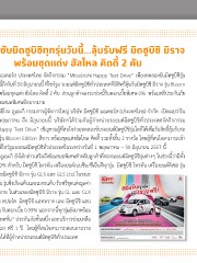 ทดลองขับมิตซูบิชิทุกรุ่นวันนี้...ลุ้นรับฟรี มิตซูบิชิ มิราจ พร้อมชุดแต่ง ฮัลโหล คิตตี้ 2 คัน มิตซูบิชิ มอเตอร์ส ประเทศไทย จัดกิจกรรม “Mitsubishi Happy Test Drive” เพียงทดลองขับมิตซูบิชิรุ่น ใดก็ได้ตั้งแต่วันนี้ถึงวันที่ 30 มิถุนายนนี้ ที่โชว์รูม รถยนต์มิตซูบิชิทั่วประเทศก็มีสิทธิ์ลุ้นรับมิตซูบิชิ มิราจ รุ่น Bloom Edition สีขาว พร้อมชุดแต่ง ฮัลโหล คิตตี้ 2 คัน ส่วนลูกค้าจองรถช่วงนี้รับดอกเบี้ยพิเศษ 0% พร้อมฟรีประกันภัย ชั้นหนึ่ง และข้อเสนอพิเศษอีกมากมาย มร. มาซะฮิโกะ อูเอะกิ กรรมการผู้จัดการใหญ่ บริษัท มิตซูบิชิ มอเตอร์ส (ประเทศไทย) จ�ากัด เปิดเผยว่าใน ระหว่างเดือนพฤษภาคม ถึง มิถุนายนนี้ บริษัทฯได้ร่วมกับผู้จ�าหน่ายรถยนต์มิตซูบิชิทั่วประเทศจัดกิจกรรม “Mitsubishi Happy Test Drive” เชิญชวนผู้ที่สนใจร่วมทดลองขับรถยนต์มิตซูบิชิรุ่นใดก็ได้เพื่อรับสิทธิ์ลุ้นรับรถ มิตซูบิชิ มิราจ รุ่น Bloom Edition สีขาว พร้อมชุดแต่งฮัลโหล คิตตี้ รวมทั้งสิ้น 2 รางวัล โดยผู้ที่สนใจสามารถเข้า ร่วมกิจกรรมได้ที่โชว์รูมรถยนต์มิตซูบิชิทั่วประเทศในระหว่างวันที่ 1 พฤษภาคม – 30 มิถุนายน 2557 นี้ ทั้งนี้ มร. อูเอะกิ ยังได้กล่าวเสริมถึงข้อเสนอพิเศษส�าหรับลูกค้าที่จองรถยนต์มิตซูบิชิรุ่นต่างๆ ในช่วงนี้ว่ามีทั้ง ดอกเบี้ยต�่าสุด 0% ส�าหรับ มิตซูบิชิ ไทรทัน เครื่องยนต์เบนซิน/ซีเอ็นจีทุกรุ่น มิตซูบิชิ ไทรทัน เครื่องยนต์ดีเซล รุ่น ดับเบิ้ลแค็บ และมิตซูบิชิ มิราจ รุ่น GLS และ GLS Ltd. ในขณะ ที่มิตซูบิชิ ไทรทัน รุ่นซิงเกิลแค็บและเมกะแค็บ รับฟรีชุดแต่งมูลค่า สูงสุด 50,000 บาท ในส่วนของมิตซูบิชิ มิราจ รุ่น GL และ GLX มิตซูบิชิ ปาเจโร สปอร์ต มิตซูบิชิ แอททราจ และ มิตซูบิชิ แลน เซอร์ อีเอ็กซ์ นั้น รับดอกเบี้ย 0.99% นอกจากนี้ทุกรุ่นยังมาพร้อม “ไดมอนด์ โปรเทคชั่น” ประกันภัยชั้นหนึ่ง และบริการช่วยเหลือ ฉุกเฉิน 24 ชั่วโมง ฟรี 1 ปี โดยผู้ที่สนใจสามารถสอบถามราย ละเอียดเพิ่มเติมได้ที่ผู้จ�าหน่ายรถยนต์มิตซูบิชิทั่วประเทศ