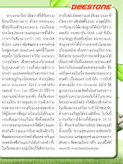 Vincente ถือว่าเป็นยางที่ได้รับความ ภายในห้องโดยสารและเสียงภายนอกที่ นิยมเป็นอย่างมาก ด้วยการออกแบบ เกิดจากยางสัมผัสพื้นถนน ล่าสุดได้รับ ดีไซน์ที่ลงตัวของลวดลาย รวมถึงคุณ การรับรองว่าได้มาตรฐานที่ทั่วโลกให้การ ประโยชน์ของยางและคุณภาพที่ได้รับ ยอมรับ จากสถาบัน RDW LAB ที่เป็น การการันตีมามากกว่า 100 ประเทศ ค่ามาตรฐานในทวีปยุโรป ดอกยางแบบ ทั่วโลก แต่ทว่าทีมพัฒนาจากค่ายยักษ์ หัวลูกศรท�าให้น�้ากระจายตัวไม่สะสม ใหญ่แบรนด์ Deestone แห่งนี้ก็ไม่เคย บริเวณหน้ายางในสภาวะถนนเปียก รวม หยุดยั้ง ในเรื่องของการวิจัย ออกแบบ ถึงยังสามารถรองรับการเบรคที่รุนแรงได้ ยางรุ่นใหม่ๆ เพื่อตอบสนองกับรถยนต์ เป็นอย่างดี เป็นที่แน่นอนว่ารถประเภทอี ในรูปแบบต่างๆ รวมถึงสภาพผิวการ โคคาร์เป็นรถยนต์โดยสารขนาดเล็ก ซึ่ง จราจร และสอดคล้องกับสภาวะการณ์ จะมีจุดอ่อนในเรื่องของสมรรถนะการ ทางเศรษฐกิจมาโดยตลอด ด้วยรุ่นใหม่ ทรงตัว เรื่องของการเข้าโค้ง การขับขี่ อย่าง Vincente R203 ยางส�าหรับ ท�าความเร็ว ยาง Vincente R203 ได้ รถยนต์ Eco Car (อีโคคาร์) ที่มีการ ถูกออกแบบและคิดค้นในส่วนของการ รออกแบบได้อย่างลงตัว ทั้งเรื่องของ ดูแลด้านความปลอดภัยให้กับทุกคน ความเงียบ ความนุ่มสบาย รวมถึงความ โดยออกแบบไหล่ยางให้มีแนวต้านด้าน ทนทานจากการรองรับแรงกระแทกช่วย ในเพิ่มสมรรถนะในการเข้าโค้งขณะขับ ให้ผู้โดยสารที่อยู่ภายในรถไม่ได้รับแรง ด้วยความเร็วสูงได้อย่างดีเยี่ยม ในวันนี้ กระเทือนมากจนเกินไป ซึ่งทั้งหมดเกิด มารองรับการใช้งานทั้งในขนาด 14-15 จากการออกแบบดอกยางให้มีความแตก นิ้ว ซึ่งจะช่วยให้การเดินทางของคุณมี ต่างกันถึง 5 แบบภายในยางเส้นเดียวกัน ทั้งรอยยิ้ม ความสุขและความปลอดภัย ซึ่งแต่ละลายต่างท�าหน้าที่แตกต่างกันแต่ Deestone แคร์คุณทุกช่วงเวลาของการ สอดคล้องซึ่งกันและกันได้อย่างลงตัว ทั้ง เดินทาง ติดตามเรื่องราวดีๆ แบบนี้ได้ที่ ในเรื่องของความนุ่มเงียบไร้เสียงรบกวน www.fb.me/deestonetyre