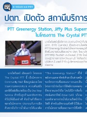 ปตท. เปิดตัว สถานีบริการน�้ามันครบวงจร PTT Greenergy Station, Jiffy Plus Supermarket และ PTT FIT Auto ในโครงการ The Crystal PTT ชัยพฤกษ์ นายไพรินทร์ ชูโชติถาวร ประธานเจ้าหน้าที่บริหารและกรรมการผู้จัดการใหญ่ บริษัท ปตท. จ�ากัด (มหาชน) เป็นประธานในพิธีเปิดตัวสถานีบริการน�้ามันครบวงจร PTT Greenergy Station ในโครงการคอมมูนิตี้ มอลล์ The Crystal PTT ถนนชัยพฤกษ์ ซึ่งเป็นความร่วมมือระหว่าง ปตท. โดย บริษัท ปตท.บริหารธุรกิจค้าปลีก จ�ากัด (PTTRM) กับบริษัท เค.อี.แลนด์ จ�ากัด โดยได้รับเกียรติจาก นายพรชัย สังวรเจต รองผู้ว่าราชการจังหวัดนนทบุรี ให้เกียรติร่วมเป็นประธานในพิธี พร้อมผู้บริหาร บริษัท เค.อี.แลนด์ จ�ากัด ผู้บริหารหน่วยธุรกิจน�้ามัน ปตท. ตลอดจนแขกผู้มีเกียรติเข้า ร่วมงาน นายไพรินทร์ เปิดเผยว่า โครงการ “The Greenergy Station” ที่ใช้ ซึ่งสามารถประหยัดค่าไฟฟ้าได้ถึงปีละ The Crystal PTT นี้ เป็นโครงการ พลังงานแสงอาทิตย์เข้ามาเป็นส่วนหนึ่ง 285,795 บาท เทียบเท่ากับลดการใช้ Community Mall ที่สมบูรณ์แบบ โดย ของโครงการเพื่อลดมลภาวะและเป็น น�้ามันดิบในการผลิตไฟฟ้า 154 บาร์เรล รวมความสะดวกสบาย ความทันสมัย โครงการน�าร่องในการใช้พลังงานทดแทน ต่อปี ซึ่งเท่ากับเป็นการลดมลภาวะต่อสิ่ง และใส่ใจต่อสิ่งแวดล้อม เป็น One Stop ที่สะอาดและยั่งยืน โดยได้มีการติดตั้ง แวดล้อมเท่ากับได้ช่วยปลูกต้นไม้ใหญ่ถึง Service ส�าหรับลูกค้าและประชาชน เซลล์แสงอาทิตย์ (Solar Cell) บริเวณ 6 ไร่ต่อปี นอกจากนี้ สถานีบริการแห่ง ทั่วไปได้เป็นอย่างดี ด้วยร้านค้าที่หลาก บนหลังคาเกาะจ่ายน�้ามันรวมถึงหน้าร้าน นี้ยังมีสถานีประจุไฟฟ้าส�าหรับรถยนต์ หลายในโครงการ ประกอบกับการเปิด จิฟฟี่ ส�าหรับผลิตกระแสไฟฟ้าไว้ใช้เอง ไฟฟ้า (Electric Vehicle Station - EV) ตัวสถานีบริการน�้ามันภายใต้แนวคิด ภายในโครงการเพื่อลดภาระการใช้ไฟฟ้า เตรียมพร้อมให้บริการชาร์จพลังงาน