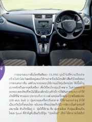 Surprise... ด้วยความกว้าง โปร่งสบาย การออกแบบภายในโดยทีมพัฒนา CELERIO มุ่งเป้าไปที่ความเรียบง่าย กว้าง โปร่ง โล่ง ร่วมสมัยอยู่เสมอ ใช้งานง่าย จึงเน้นโทนสีด�าเป็นหัวใจหลักของ การตกแต่งภายใน แต่ตัวเบาะออกแบบให้อารมณ์วัยรุ่นนิดหน่อย ใช้เนื้อผ้าบุ เบาะหลักเป็นลายจุดสีเหลือง เพื่อให้โดนใจกลุ่มเป้าหมาย ในส่วนของการ ออกแบบคอนโซลดีไซน์ไม่ได้โฉบเฉี่ยวนัก แต่ว่ามีการใช้เส้นสายหนาบาง ท�าให้ เกิดมิติที่น่าชวนมอง ประกอบกับการวางต�าแหน่งเครื่องเล่น CD พร้อมช่องต่อ USB แบบ Built in ปุ่มควบคุมเครื่องปรับอากาศ ที่ใช้งานแบบง่ายๆ ท�าให้ เนียนกริบไปทั้งคอนโซล ขยับลงมาที่คอนโซลเกียร์มีการจัดวางในต�าแหน่งที่ เหมาะมือ หัวเกียร์มีอยู่ 2 ปุ่มให้ใช้งาน คือ ปุ่มคายล็อค กับปุ่มเปลี่ยนเป็น โหมด Sport ที่ส�าคัญที่แป้นเกียร์มีปุ่ม “ปลดล็อค” เกียร์ ให้สามารถใส่เกียร์