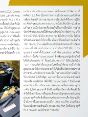 เปิดฝากระโปรงขุมพลังของ All New SUZUKI Celerio กม./ชม. ถ้าเราไม่ทราบมาก่อนว่าเครื่องยนต์ 1.0 ลิตร เราก็ เป็นรหัส K10B แบบ 3 สูบแถวเรียง DOHC 12 วาล์ว ความ คงคิดว่า 1.2 ลิตร เนื่องจากว่าความเร็วปลายเอาแบบไม่ต้อง จุกระบอกสูบ 998 ซีซี. กระบอกสูบ x ช่วงชัก 79.0 x 79.4 รอไหลเพิ่มอยู่ที่ 165 กม./ชม. (จากเรือนไมล์) ซึ่งในความรู้สึก มม. อัตราส่วนก�าลังอัด 11.0 : 1 จ่ายเชื้อเพลิงด้วยหัวฉีด ผม คือ เกินพอแล้ว เพราะรถประเภทนี้เน้นที่จะใช้งานในเมือง อีเล็กทรอนิคส์ Multi-Point Injection ให้ก�าลังสูงสุด 68 แต่ในตลาดเมืองไทยพฤติกรรมผู้บริโภคเปลี่ยนไป คนต่าง แรงม้า ที่ 6,200 รอบ/นาที แรงบิดสูงสุด 90 นิวตัน-เมตร จังหวัดซื้อรถประเภทนี้ใช้งานมากขึ้น ขับไป-กลับท�างาน หรือ ที่ 3,500 รอบ/นาที ระบบส่งก�าลังแบบเกียร์ CVT ที่ติดตั้ง ท�าธุระจังหวัดใกล้เคียง 80-150 กม. ให้ได้สบายๆนั้น จึงต้อง ตัวระบายความร้อนของน�้ามันอยู่ในตัว จริงๆ แล้วพูดถึง ปรับขยับความแรงให้มากขึ้น เผื่อเอาไว้แซงในความเร็วเกิน เครื่องยนต์ 1.0 ลิตร ความคาดหวังว่าจะแรงคงไม่มีอยู่ใน 100 กม./ชม.บ้าง แต่เครื่องยนต์อย่างเดียวคงจะสร้างอัตรา หัวของผม แต่จากที่สัมผัสในเรื่องของอัตราเร่งถือว่าไม่ เร่งแบบนี้ไม่ได้ หากไม่ท�างานร่วมกับเกียร์ CVT ที่มีการปรับ น้อยหน้า 1.2 ลิตร ยิ่งความเร็วจากหยุดนิ่งไปจนถึง 140 จูนมาอย่างลงตัวทั้งในรอบความเร็วต้น และปลาย แต่ที่น่า สนใจกว่านั้นคือ “Sport Mode” ซึ่งเพียงคุณกดปุ่มข้างเกียร์ ให้มีสัญลักษณ์ตัว “S” ขึ้นคู่กับต�าแหน่ง “D” ที่เรือนไมล์เป็น “Ds” ระบบส่งก�าลังจะถูกปรับเปลี่ยนให้สามารถดึงก�าลัง สูงสุดออกมาใช้ ลากรอบความเร็วได้เพิ่มขึ้น อัตราการทดของ สายพานในเกียร์จะท�างานต่อเนื่องในต�าแหน่งที่ส่งก�าลังให้รถ วิ่งไปข้างหน้าได้เร็วที่สุด นอกจากนั้นเวลายกคันเร่งยังจะมี รอบเครื่องยนต์มารอ เพื่อให้มี “Engine Brake” ช่วยในการ เบรคให้ง่ายขึ้น หรือหากจะเร่งต่อรอบเครื่องยนต์จะอยู่ใน ระดับ 3,500 รอบ/นาที ซึ่งเป็นจุดที่แรงบิดมาเต็มที่พอดี จึง ท�าให้ใช้เวลาน้อยมากที่คุณจะเรียกแรงม้าสูงสุดออกมาในการ เร่งแซง สุดท้ายคือ สิ่งที่หลายๆ ท่านอย่างทราบคือ อัตราเฉลี่ย น�้ามันจากที่โรงงานเคลมเอาไว้ว่า 23.5 กม./ลิตร ส่วนตัวผม วิ่งนอกเมืองความเร็วเฉลี่ย 80 กม./ชม. ชิวๆ ไปเรื่อยๆ อยู่ที่ 26.5 กม./ลิตร (แก๊สโซฮอล 95) ครับ