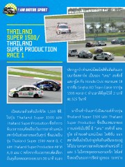 Thailand Super 1500/ Thailand Super Production Race 1 ปรากฏกว่า ต�าแหน่งโพลโพสิชั่นอันดับแรก บนกริดสตาร์ท เป็นของ “เคน” สรศักดิ์ แสง-ชูโต กับ Honda Civic หมายเลข 18 จากทีม Singha XO Team Eakie จากรุ่น 1500 คลาส C ท�าเวลาดีที่สุดไว้ที่ 2 นาที 41.325 วินาที เปิดสนามด้วยตัวเล็กพิกัด 1,500 ซีซี. มาถึงเช้าวันเสาร์เปิดเกมส์ด้วยรุ่น ในรุ่น Thailand Super 1500 และ Thailand Super 1500 และ Thailand Thailand Super Production ซึ่งท�าการ Super Production ซึ่งเป็นเรซแรกของ จับเวลารอบคัดเลือกในการหาต�าแหน่ง การแข่งขันในปีนี้ มี “เคน” สรศักดิ์ แสง- สตาร์ทในช่วงสายของวันศุกร์ ซึ่งแบ่งเป็น ชูโต เจ้าของต�าแหน่งโพล โพซิชั่น ออก รุ่น Thailand Super 1500 คลาส B, C สตาร์ทขึ้นน�าเป็นจ่าฝูงทันที แต่ยืนระยะอยู่ และ Thailand Super Production คลาส ได้ไม่นานทนความกดดันของต�าแหน่งที่ 2 A, B และ C หลังจากจับเวลารอบคัดเลือก และ 3 ไม่ไหวหลุดออกนอกแทร็ก ไฮไลต์ อันดุเดือดตลอดระยะเวลา 30 นาที จบลง จึงตกเป็นของการชิงจ่าฝูงของ ระหว่าง