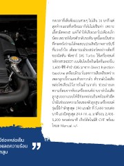 กดเวลาที่เส้นชัยแบบสวยๆ ไม่เกิน 16 นาที แต่ สุดท้ายแผนที่เตรียมมาก็ล่มไม่เป็นท่า เพราะ เลี้ยวผิดทาง!! แต่ก็ท�าให้เสียเวลาไปเพียงเล็ก น้อย เพราะยังไหวตัวกลับรถทัน จุดนี้เองเป็นช่วง ที่คาดหวังว่าจะได้ทดสอบประสิทธิภาพการขับขี่ ที่แรงเร้าใจ เต็มอารมณ์รถสปอร์ตอย่างเต็มที่ ของนิสสัน พัลซาร์ DIG Turbo ใช้เครื่องยนต์ รหัส MR16DDT เบนซินไดเร็คอินเจ็คชั่นเทอร์โบ 1,600 ซีซี ค�าว่า DIG มาจาก Direct Injection Gasoline เคลือบผิวนาโนลดการเสียดสีระหว่าง เพลาลูกเบี้ยวและตัวยกวาล์ว ตัววาล์วไอเสีย หล่อโซเดียมไว้ภายในก้านวาล์ว ช่วยถ่ายเท ความร้อนจากห้องเครื่องยนต์ผ่านวาล์วไอเสีย ลูกสูบออกแบบให้มีช่องหล่อเย็นพร้อมหัวฉีด น�้ามันช่วยลดความร้อนของตัวลูกสูบ เครื่องยนต์ รุ่นนี้มีก�าลังสูงสุด 190 แรงม้า ที่ 5,600 รอบต่อ นาที แรงบิดสูงสุด 24.4 กก.-ม. มาที่รอบ 2,400- 5,200 รอบต่อนาที เกียร์อัตโนมัติ CVT พร้อม โหมด Manual +/- ลูกสูบออกแบบให้มีช่องหล่อเย็น พร้อมหัวฉีดน�้ามันช่วยลดความร้อน ของตัวลูกสูบ