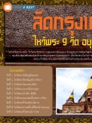 ทริป อิ่มบุญ สุขใจ ไหว้พระ 9 วัด ใน จ.พระนครศรีอยุธยา ซึ่งอยู่ห่างจากกรุงเทพประมาณ 76 กิโลเมตร เดินทางไม่กี่นาที คุณก็จะสัมผัสถึงมนต์เสน่ห์และกลิ่นอายแห่งเมืองหลวงเก่า สงบจิตสงบใจกับการสักการะสิ่งศักดิ์สิทธิ์คู่บ้านคู่เมือง พร้อมทั้งศึกษาประวัติศาสตร์อันมีค่าแห่งสยามประเทศในเวลาเดียวกัน ่ โปรแกรมเทียว วัดที่ 1. ไหว้พระวัดใหญ่ชัยมงคล วัดที่ 2. ไหว้พระวัดพนัญเชิงวรวิหาร วัดที่ 3. ไหว้พระวัดมงคลบพิตร วัดที่ 4. ไหว้พระนอนวัดโลกยสุธา วัดที่ 5. ไหว้พระเจ้าเสือ วัดตึก วัดที่ 6. ไหว้พระหลวงพ่อยิ้มวัดท่าการ้อง วัดที่ 7. ไหว้พระที่วัดกษัตราธิราช วัดที่ 8. ไหว้พระทรงเครื่องที่วัดหน้าพระเมรุ วัดที่ 9. ไหว้พระที่วัดธรรมิการาช