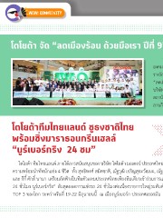 โตโยต้า จัด “ลดเมืองร้อน ด้วยมือเรา ปีที่ 9” เดินหน้าถ่ายทอดความรู้สู่สาธารณชน พระบาทสมเด็จพระเจ้าอยู่หัวฯ ทรงพระกรุณาโปรดเกล้าฯให้ นายพลากร สุวรรณรัฐ องคมนตรี เป็นผู้แทนพระองค์ฯ มอบถ้วยรางวัลพระราชทานแก่โรงเรียนและเทศบาลที่ได้รับ รางวัลชนะเลิศจากการประกวดโครงงานด้านสิ่งแวดล้อมและโล่ประกาศเกียรติคุณในโครงการ “ลดเมืองร้อน ด้วยมือเรา” ปีที่ 9 โดยมี นายนินนาท ไชยธีรภิญโญ รองประธานกรรมการ บริษัท โตโยต้า มอเตอร์ ประเทศไทย จำากัด และ ดร. ขวัญฤดี โชติชนาทวีวงศ์ ผู้อำานวยการ สถาบันสิ่งแวดล้อมไทย พร้อมด้วยผู้บริหารระดับสูงจากทั้ง 2 องค์กร ร่วมเป็นสักขีพยาน ณ ลานกิจกรรม ศูนย์การค้าซีคอนสแควร์ ถนนศรีนครินทร์ โตโยต้าทีมไทยแลนด์ ชูธงชาติไทย พร้อมซิ่งมาราธอนกรีนเฮลล์ “นูร์เบอร์กริง 24 ชม” โตโยต้า ทีมไทยแลนด์ ภายใต้การสนับสนุนของ บริษัท โตโยต้า มอเตอร์ ประเทศไทย จำากัด ประกาศ ความพร้อมนำาทัพนักแข่ง 4 ชีวิต ทั้ง สุทธิพงศ์ สมิตชาติ, ณัฐวุฒิ เจริญสุขะวัฒนะ, ณัฐพงษ์ ห่อทองคำา และ กีกี้ ศักดิ์ นานา เตรียมลัดฟ้าเป็นทีมตัวแทนประเทศไทยเพียงทีมเดียวเข้าร่วมการแข่งขัน “รายการ 24 ชั่วโมง นูร์เบอร์กริง” กับสุดยอดการแข่งรถ 24 ชั่วโมงต่อเนื่องรายการใหญ่ระดับตำานานติดอันดับ TOP 3 ของโลก ระหว่างวันที่ 19-22 มิถุนายนนี้ ณ เมืองนูร์เบอร์ก ประเทศเยอรมัน