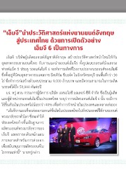 “เอ็มจี”น�าประวัติศาสตร์แห่งยานยนต์อังกฤษ สู่ประเทศไทย ด้วยการเปิดตัวอย่าง เอ็มจี 6 เป็นทางการ เอ็มจี บริษัทผู้ผลิตรถยนต์สัญชาติอังกฤษ สร้างประวัติศาสตร์หน้าใหม่ให้กับ อุตสาหกรรมยานยนต์ไทย กับการแนะนำารถยนต์เอ็มจี6 ทั้งรูปแบบรถยนต์นั่งและรถ ฟาสต์แบ็ค 5 ประตู รถยนต์เอ็มจี 6 จะทำาการผลิตที่โรงงานประกอบรถยนต์ของเอ็มจี ซึ่งตั้งอยู่ที่นิคมอุตสาหกรรมเหมราช อีสเทิร์น ซีบอร์ด ในจังหวัดชลบุรี บนพื้นที่กว่า 30 ไร่ ซึ่งทำาการก่อสร้างด้วยงบประมาณ 9,000 ล้านบาท และมีความสามารถในการผลิต รถยนต์ได้ถึง 50,000 คันต่อปี มร. หวู่ ฮวน กรรมการผู้จัดการ บริษัท เอสเอไอซี มอเตอร์-ซีพี จำากัด ซึ่งเป็นผู้ผลิต และผู้จำาหน่ายรถยนต์เอ็มจีในประเทศไทย ระบุว่าการผลิตรถยนต์เอ็มจี 6 นั้น จะมีการ ใช้ชิ้นส่วนในประเทศไม่น้อยกว่า 40% เพื่อทำาการจำาหน่ายในประเทศและตลาดส่งออก “เอ็มจีวางแผนที่จะส่งออกรถยนต์ที่ผลิตในประเทศไทยไปยังประเทศที่ใช้งานรถยนต์ พวงมาลัยขวาทั่วโลก ซี่งจะทำาให้ ประเทศไทยก้าวขึ้นเป็นฐานการ ผลิตรถยนต์พวงมาลัยขวาของ เอ็มจี และเราจะเดินหน้าแผน การตลาดสำาหรับการส่งออก เพื่อสนับสนุนการผลิตรถยนต์ใน โรงงานแห่งนี้” นายหวู่กล่าว
