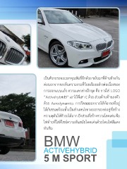 เป็นตัวกะระยะเวลาคุณขับขี่อีกด้วย ขยับมาที่ด้านข้างกัน ต่อนอกจากจะเห็นความงามที่ร้อยเรียงอย่างต่อเนื่องของ การออกแบบแล้ว ความแตกต่างอีกจุด คือ การใส่ LOGO “Activehybrid5” เอาไว้ที่เสา C ด้วย ส่วนด้านท้ายลงตัว ด้วย Aerodynamics การรีดลมออกจากใต้ท้องรถที่อยู่ ใต้กันชนพร้อมทั้งเป็นต�าแหน่งทางออกของท่อคู่ที่สร้าง ความดุดันให้ตัวรถได้มาก อีกส่วนที่สร้างความโดดเด่น คือ ไฟท้ายที่ใส่ดีไซน์ความทันสมัยโดดเด่นด้วยโคมไฟสีแดง ทับทิม BMW ACTIVEHYBRID 5 M SPORT