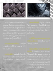 อย่างแรกควรเปลี่ยนยางเมื่อไรดี ดอกยางเริ่มไม่มี วิธีดูก็คือ ให้สังเกต ระยะเวลาที่แน่นอนของการเปลี่ยนยาง ในร่องของดอกยาง มันจะมีขีดเล็กๆ อยู่ ไม่มีก�าหนดที่ตายตัว ขึ้นอยู่กับสภาพยาง ระหว่างร่องกลางของลายยาง ถ้าดอก เป็นหลัก ซึ่งสภาพของยางนั้นเป็นผลมา ยางเรียบเสมอกับขีดเมื่อไหร่ ก็ได้เวลา จากการใช้งานของผู้ขับขี่ แต่โดยทั่วไป เปลี่ยนครับ วิธีสังเกต หรือสัญญาณที่บ่งบอกว่าถึง เวลาที่เราควรเปลี่ยนยาง ได้แก่ กรณีที่ขับกระแทกหลุมอย่างแรง แก้มยางเกิดบวม หรือปูดขึ้นมา แนะน�า ยางหมดอายุการใช้งาน โดยทั่วไป ให้เปลี่ยนยางทันที ยางจะมีอายุการใช้งาน ประมาณ 2 ปี หรือ 50,000 กม. แล้วจะเปลี่ยนยางใหม่ ต้องเลือกกัน อย่างไร ไม่ยากครับ เอาง่ายๆ ควรเลือก ยางเริ่มแข็งตัว จะเกิดเสียงดังเวลาวิ่ง ใช้ขนาดเดิมที่ติดรถออกมาจากโรงงาน หรือหากลองเอาเล็บจิกลงไปบนเนื้อยาง ประกอบรถยนต์ เพราะได้ผ่านการ ก็จะสัมผัสได้ถึงความไม่ยืดหยุ่นของเนื้อ ทดสอบในทุกสภาวะการใช้งานมาแล้ว ยาง จากโรงงานฯ ว่าปลอดภัย คุ้มค่า และให้ ความสะดวกสบายในการขับขี่ แต่เราควร ทราบอะไรบ้างก่อนไปซื้อยาง