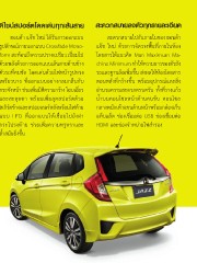 ฮอนด้า แจ๊ช ใหม่ ได้รับการออกแบบ สะดวกสบายไปกับภายในของ ฮอนด้า รูปลักษณ์ภายนอกแบบ Crossfade Mono- แจ๊ช ใหม่ ด้วยการจัดวางพื้นที่ภายในห้อง form สะท้อนถึงความปราดเปรียว เปี่ยมไป โดยสารใต้แนวคิด Man Maximum Ma- ด้วยพลังด้วยการออกแบบเส้นสายด้านข้าง chine Minimum ท�าให้ความยาวของตัวถัง ตัวรถที่คมชัด โดดเด่นด้วยไฟหน้ารูปทรง รถและฐานล้อเพิ่มขึ้น ส่งผลให้ห้องโดยสาร เพรียวบาง ที่ออกแบบอย่างกลมกลืนกับ ตอนหลังที่กว้างขึ้น พร้อมอุปกรณ์และสิ่ง กระจังหน้า ช่วยเพิ่มมิติความกว้าง โฉบเฉี่ยว อ�านวยความสะดวกครบครัน ทั้งที่วางแก้ว และสะดุดตา พร้อมเพิ่มลุคสปอร์ตด้วย น�้าบนคอนโซลหน้าด้านคนขับ คอนโซล สเกิร์ตข้างและสปอยเลอร์หลังพร้อมไฟท้าย กลางพนักเท้าแขนด้านหน้าพร้อมกล่องเก็บ แบบ LED ที่ออกแบบให้เชื่อมไปยังฝา แท็บแล็ต ช่องเชื่อมต่อ USB ช่องเชื่อมต่อ กระโปรงท้าย ช่วยเพิ่มความหรูหราและ HDMI และช่องจ�าหน่ายไฟส�ารอง ล�้าสมัยยิ่งขึ้น