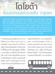 โตโยต้า ส่งมอบถนนแห่งรอยยิ้ม จ.ชุมพร นายพีระศักดิ์ หินเมืองเก่า ผู้ว่าราชการจังหวัดชุมพร และนายวุฒิกร สุริยะฉันทนานนท์ ผู้ช่วยกรรมการผู้จัดการใหญ่อาวุโส บริษัท โตโยต้า มอเตอร์ ประเทศไทย จ�ากัด ร่วม เป็นประธานในพิธีส่งมอบถนนต้นแบบแห่งความปลอดภัย “โครงการถนนแห่งรอยยิ้ม” แก่แขวงการทางจังหวัดชุมพร โดยมี จ่าสิบเอก ประสิทธิ์ มณีแดง ผู้อ�านวยการแขวง การทางชุมพร และ บริษัท โตโยต้าชุมพร ผู้จ�าหน่ายโตโยต้า จ�ากัด พร้อมด้วยเครือข่าย ความปลอดภัยบนท้องถนน ร่วมเป็นสักขีพยานในการส่งมอบโครงการปรับปรุงถนนให้ ปลอดภัยใน 5 ภูมิภาคของประเทศไทย โดยถนนแห่งรอยยิ้ม จ.ชุมพร ถือเป็นแห่งที่ 3 ใน วันพุธที่ 18 มิถุนายน ที่ผ่านมา ณ แยกปฐมพร จ.ชุมพร การปรับปรุงถนนและเส้นทางจราจร ภาย ถนนในระดับจังหวัด สาธารณสุขจังหวัด ใต้หลักการทางวิศวกรรมจราจรความ ชุมพร ขนส่งจังหวัดชุมพร ส�านักงาน ปลอดภัยทางถนน ผนวกกับการปรับปรุง ทางหลวงและส�านักงานทางหลวงชนบท ภูมิสถาปัตย์และสิ่งแวดล้อม ให้เหมาะสม ส�านักงานป้องกันและบรรเทาสาธารณภัย กับพื้นที่และเกิดประโยชน์สูงสุด ซึ่งได้รับ จังหวัดชุมพร และ บริษัท โตโยต้าชุมพร ความร่วมมือจากภาคีเครือข่ายในท้องถิ่น ผู้จ�าหน่ายโตโยต้า จ�ากัด โดยลักษณะของ ได้แก่ องค์การบริหารส่วนจังหวัด แขวงการ ถนนแห่งรอยยิ้มแห่งที่ 3 ประกอบไปด้วย ทางจังหวัดชุมพร สถานีต�ารวจภูธรจังหวัด ชุมพร คณะท�างานสนับสนุนการด�าเนิน งานป้องกันและแก้ไขอุบัติเหตุจราจรทาง