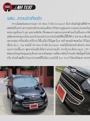 ผสม...ความต่างที่ลงตัว ความโดดเด่นของภายนอก All-New FORD Ecosport ถือว่าเป็นตัวชูโรงที่ดีส�าหรับรถคันนี้ เนื่องจากการ ผสมข้อดีระหว่างความคล่องตัวของคอมแพ็คคาร์กับความสูงและความอเนกประสงค์ของ SUV ท�าให้มีหน้าตา ออกมาดูแข็งแกร่ง สูง และกะทัดรัด เรื่องของความสวยงามของตัวรถเป็นเรื่องนานาจิตตังว่าสวย ไม่สวย แล้ว แต่ใครจะชอบแบบไหน ผมขอไปแนะน�าอรรถประโยชน์ที่คันนี้มีให้ดีกว่าอย่างแรกต้องเป็นเรื่องความกะทัดรัด เหมาะสมมากที่จะเป็นรถที่น�ามาใช้ในเมืองไร้ปัญหาในการเข้าซอยเล็กซอยน้อย ไร้ปัญหาในการหาที่จอดเอา เป็นว่า Eco Car จอดได้ All-New FORD Ecosport จอดได้ไม่น้อยหน้าเช่นกัน ต่อมาเป็นเรื่องความสูงที่ นอกจากจะขึ้น-ลง ฟุตบาทในเมืองได้อย่างง่ายดายแล้ว หากมีเวลาเดินทางแบบ Off Road เล็กๆ คันนี้ก็ พร้อมจะไปลุยกับคุณแน่ๆ อีกอย่างหากเกิดเหตุการณ์ไม่คาดฝันน�้าท่วมอีก คันนี้ลุยน�้าได้แบบชิวๆ 55 ซม.นะ ครับ ส่วนตัวผมถือว่าอเนกประสงค์ดีไม่น้อย แถมยังมี Sun Roof ให้ผมนั่งชมดาวยามค�่าคืนอีกด้วย