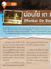 ม่อนไข่ เด บีช (Monkai De Beach) ถ้าคุณก�าลังมองหาร้านอาหารริมทะเลบรรยากาศดี วันนี้เรามีร้านอาหารริมทะเลมาแนะน�ากันค่ะ “ม่อนไข่ เด บีช” (Monkai De Beach ร้านอาหารสไตล์รีสอร์ท เน้นที่นั่งสบาย หมอนอิงลายน่ารัก จะนั่ง จะเอน จะนอน ก็ชิวกันได้ตามอัทธยาศัย ลมทะเลพัดเย็นๆ กับบรรยากาศน่ารักของร้าน วิวสวยเหมาะกับการดู พระอาทิตย์ตกดินยามเย็น การบริการจากเจ้าของร้าน และน้องๆ พนักงาน ก็อบอุ่นเป็นกันเอง ส่วนเมนูอาหารของ ม่อนไข่ เด บีช นั่งมากๆ ส่วนอาหารก็อร่อยถูกใจ “ม่อน (Monkai De Beach) เน้นอาหารไทย ไข่ เด บีช” (Monkai De Beach) ซีฟู๊ด รสชาติอร่อย แต่ราคาไม่แพง มีเมนู หลากหลายให้ได้เลือกทานกัน ส่วนเมนู การเดินทางมาร้านก็ไม่ยากค่ะ อยู่ใกล้ เครื่องดื่มที่ขึ้นชื่อของร้านก็คือ Caipiro- กับสวนนงนุช ถ้ามาจากถนนสุขุมวิท ska ซึ่งเป็น Coktail สัญชาติบราซิเลี่ยน จะผ่านสวนนงนุช แล้วเลี้ยวขวาเข้ามา รสชาติออกเปรี้ยวๆ หวานๆ ถูกใจสาวๆ ในซอยนาจอมเทียน 56 จากนั้นก็ขับ เป็นอย่างยิ่ง ตรงมาเรื่อยๆ จนถึงถนนเลียบทะเลแล้ว เจอบรรยากาศของที่นี่ครั้งแรกถึงกับ เลี้ยวซ้าย หลงรักกันเลยค่ะ เพราะร้านตกแต่งได้น่า