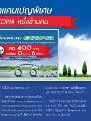 บริดจสโตน จัดแคมเปญพิเศษ ่ ฉลองยอดผู้ใช ECOPIA หนึงล้านคน ้ วันนี้ ถึง 30 กันยำยน 2557 0-2636-1555 (กรุงเทพฯ และปริมณฑล) หรือ 1800-295-537 (ต่ำงจังหวัดโทรฟรี) หลำกหลำยช่องทำงกำรลงทะเบียน รับสิทธิ์พิเศษ www.bridgestone.co.th *สถิติกำรจ�ำหน่ำยยำง ECOPIA ตั้งแต่ www.cockpit.co.th, www.facebook.com/ ม.ค. 2552 - มี.ค. 2557 ในภูมิภำคเอเชีย Cockpitfc และ www.autoboy.co.th หรือ แปซิฟิก ข้อมูลจำก Bridgestone Asia สอบถำมแผนกลูกค้ำสัมพันธ์ โทรศัพท์ Pacific Pte. Ltd. (BSCAP)