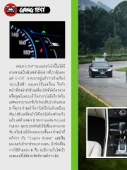 ต่อมา E-CVT ระบบส่งก�าลังนี้ไม่ได้มี สายพานเป็นตัวส่งก�าลังอย่างที่เราคุ้นเคย แต่ E-CVT บ่งบอกอยู่แล้วว่าเป็นเกียร์ ระบบไฟฟ้า มอเตอร์ขับเคลื่อน จึงท�า หน้าที่ส่งก�าลังขับเคลื่อนไปที่ล้อโดยตรง หรือพูดกับแบบเข้าใจง่ายๆ ไม่มีเกียร์ครับ แต่พอเรามามองที่เกียร์จะเห็นว่า ต�าแหน่ง D ที่ทุกๆ ท่านเข้าใจว่าใส่เกียร์แล้วเหยียบ คันเร่งขับเคลื่อนไปได้โดยไม่ต้องท�าอะไร แล้ว แต่ต�าแหน่ง B ของ Honda Accord Hybrid จุดประสงค์หลักใช้เพื่อลงทางลาด ชัน หรือช่วยให้ระยะเบรกสั้นลง ท�าหน้าที่ คล้ายๆ กับ “Engine Brake” แต่เป็น มอเตอร์เข้ามาช่วยเบรกแทน อีกข้อดีใน การใช้ต�าแหน่ง B คือ จะมีการเก็บไฟเข้า แบตเตอรี่ได้มีประสิทธิภาพดีกว่าเดิม