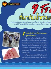 9 โรคร้าย ่ ทีมากับน�้าท่วม และ หลังน�้าลด เมื่อย่างเข้าสู่ฤดูฝน หรือฤดูน�้าหลาก ภาวะน�้าท่วม ถือว่าเป็นทุกข์แรกของเราที่ต้องเผชิญ.. แต่หลังจากนั้นก็ต้องเตรียมรับมือกับทุกข์ที่สองกันค่ะ นั่นก็คือ โรคภัยที่มาพร้อมกับน�้าท่วม และหลังน�้าท่วม i AM CARE ฉบับนี้ เรามี 9 โรคที่ควรระวัง และวิธีป้องกันเบื้องต้น มาฝากค่ะ 1 โรคน�้ำกัดเท้ำจำกเชื้อรำและแผล 2 พุพองเป็นหนอง ซึ่งเกิดจากการย�่าน�้าหรือแช่น�้าที่มีเชื้อโรค หรืออับชื้นจากเสื้อผ้าและเครื่องแต่งกายที่ไม่ สะอาดเป็นเวลานาน โดยจะมีอาการเท้าเปื่อย เป็นหนอง และเริ่มคันตามซอกนิ้วเท้า ผิวหนัง ลอกเป็นขุย จากนั้นผิวหนังจะพุพอง นิ้วเท้า หนาและแตก มีโอกาสเกิดโรคแทรกซ้อน คือ ผิวหนังอักเสบ ป้องกันได้ด้วยการเช็ดเท้าให้แห้ง หากมี บาดแผลควรใช้แอลกอฮอล์เช็ดแล้วทาด้วยยา ฆ่าเชื้อ