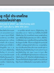 บีเอ็มดับเบิลยู กรุ๊ป ประเทศไทย เปิดตัวนวัตกรรมใหม่ล่าสุด บีเอ็มดับเบิลยู X4 XDRIVE20D M SPORT และ บีเอ็มดับเบิลยู 420I GRAN COUPE M SPORT โฉมใหม่ในงาน BMW XPO 2014 บีเอ็มดับเบิลยู กรุ๊ป ประเทศไทย เปิดตัวนวัตกรรมแห่ง มร.แมทธิอัส พฟาลซ์ ประธาน บีเอ็มดับเบิลยู กรุ๊ป ยนตรกรรมล่าสุด บีเอ็มดับเบิลยู X4 xDrive20d M Sport ประเทศไทย กล่าวว่า “BMW Xpo ในปีนี้เป็น อีกหนึ่งปีที่ และ บีเอ็มดับเบิลยู 420i Gran Coupe M Sport ที่เปิดตัว บีเอ็มดับเบิลยู กรุ๊ป ประเทศไทยน�าเสนอยานยนต์ระดับหรู ในประเทศไทยเป็นครั้งแรกในงาน BMW Xpo 2014 ซึ่งจัด คุณภาพดีเยี่ยมที่สุดในแต่ละประเภทการใช้งาน เพื่อให้ทุก แสดงนวัตกรรมและการดีไซน์แห่งยนตรกรรม ระดับหรู ท่านได้สัมผัสประสบการณ์เหนือระดับในแบบฉบับของบีเอ็ม พร้อมรับข้อเสนอสุดพิเศษ ระหว่างวันที่ 11 ถึง 14 กันยายน ดับเบิลยูอย่างใกล้ชิด ทั้งในความเป็นผู้น�าด้านเทคโนโลยี พ.ศ. 2557 ณ ศูนย์การค้าเซ็นทรัลเวิลด์ นอกจากนี้ ยังมีการ การดีไซน์ รวมถึงสุดยอดในด้านวิศวกรรม ยานยนต์ ผู้ร่วม จัดแสดงยนตรกรรมหรูบีเอ็มดับเบิลยูรุ่นอื่นๆ รวม 11 รุ่น ชมงานไม่เพียงแต่จะได้พบนวัตกรรมยานยนต์ล่าสุดจาก อาทิบีเอ็มดับเบิลยู X5 xDrive30d M Sport, บีเอ็มดับเบิลยู บีเอ็มดับเบิลยู ด้วยบีเอ็มดับเบิลยู X4 xDrive20d M Sport X1 sDrive18i xLine, บีเอ็มดับเบิลยู X3 xDrive20d และบีเอ็มดับเบิลยู 420i Gran Coupe M Sport เพียง Highline, บีเอ็มดับเบิลยู 528i M Sport และนวัตกรรมแห่ง เท่านั้น แต่ยังได้สัมผัสกับผู้น�าแห่งยนตรกรรมในอนาคต อนาคต บีเอ็มดับเบิลยู i8 ส�าหรับบีเอ็มดับเบิลยู มอเตอร์ราด บีเอ็มดับเบิลยู i8 ปลั๊ก-อินไฮบริดสายพันธุ์สปอร์ตสุดหรู รวม ได้รับการจัดแสดงมากถึง 8 รุ่น ในจ�านวนนี้รวมมอเตอร์ไซค์ ทั้งมอเตอร์ไซค์บีเอ็มดับเบิลยูรุ่นล่าสุดที่มาครบทุกเซ็กเมนต์ บีเอ็มดับเบิลยูสัญชาติไทยทั้งสองรุ่นได้แก่ บีเอ็มดับเบิลยู ให้ลูกค้าทุกท่านได้สัมผัสนวัตกรรมรุ่นล่าสุดในงานอีกด้วย” F 800 R และบีเอ็มดับเบิลยู F 800 GS
