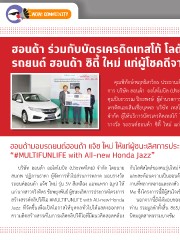 ฮอนด้า ร่วมกับบัตรเครดิตเทสโก้ โลตัส วีซ่า มอบโชคใหญ่ รถยนต์ ฮอนด้า ซิตี้ ใหม่ แก่ผู้โชคดีจากแคมเปญ “ช้อป..ลุ้น..รับ” คุณพิทักษ์ พฤทธิสาริกร ประธานเจ้าหน้าที่บริหารปฏิบัติ การ บริษัท ฮอนด้า ออโตโมบิล (ประเทศไทย) จ�ากัด และ คุณปิยะวรรณ ปิยะพงษ์ ผู้อ�านวยการอาวุโสสายธุรกิจบัตร เครดิตและสินเชื่อบุคคล บริษัท เทสโก้ คาร์ด เซอร์วิสเซส จ�ากัด ผู้ให้บริการบัตรเครดิตเทสโก้ โลตัส วีซ่า ร่วมมอบ รางวัล รถยนต์ฮอนด้า ซิตี้ ใหม่ แก่คุณก�าพล ศรีจ�าเริญ ฮอนด้ามอบรถยนต์ฮอนด้า แจ๊ซ ใหม่ ให้แก่ผู้ชนะเลิศการประกวดคลิปวิดีโอ “#MULTIFUNLIFE with All-new Honda Jazz” บริษัท ฮอนด้า ออโตโมบิล (ประเทศไทย) จ�ากัด โดยนาย กับไลฟ์สไตล์ของคนรุ่นใหม่ ซึ่งสนุกกับชีวิตที่เป็นได้มากกว่าหนึ่ง สมภพ ปฏิภานธาดา ผู้จัดการทั่วไปส่วนการตลาด มอบรางวัล และสะท้อนความเป็นฮอนด้า แจ๊ซ ใหม่ ที่ตอบสนองทุกการใช้ รถยนต์ฮอนด้า แจ๊ซ ใหม่ รุ่น SV สีเหลือง แอทแทรก (มุก) ให้ งานที่หลากหลายและลงตัว ภายใต้แนวคิด New Definition of แก่ นางสาวจริงจิตร ชัยพยุงพันธ์ ผู้ชนะเลิศการประกวดโครงการ Me ซึ่งโครงการนี้มีผู้สนใจเข้าร่วมเป็นจ�านวนมาก สร้างสรรค์คลิปวิดีโอ #MULTIFUNLIFE with All-new Honda นอกจากนี้ยังได้มอบของรางวัลให้แก่ผู้เข้ารอบสุดท้ายทั้ง 10 Jazz ที่จัดขึ้นเพื่อเปิดโอกาสให้บุคคลทั่วไปได้แสดงออกทาง ท่าน รวมมูลค่าทั้งสิ้น 865,000 บาท ณ ศูนย์ฝึกอบรมฮอนด้า ความคิดสร้างสรรค์ในการผลิตคลิปวิดีโอที่มีแนวคิดสอดคล้อง นิคมอุตสาหกรรมบางชัน