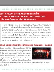 “อีซูซุ” ชวนน้องๆ ประชันไอเดียการตลาดสุดจี๊ด! ในโครงการ “ISUZU MARKETING BRAINS CHALLENGE 2014” ชิงทุนการศึกษารวมกว่า 1,000,000 บาท บริษัท ตรีเพชรอีซูซุเซลส์ จ�ากัด เชิญชวนนิสิต นักศึกษาที่ก�าลังศึกษาอยู่ในระดับ อุดมศึกษา ร่วมสร้างสรรค์ไอเดียการตลาดสุดจี๊ด! เพื่อเฟ้นหาสุดยอดนักวางแผนการ ตลาดทางดิจิตอล (Digital Marketing) พร้อมท�า Storyboard ส�าหรับ Online VDO Clip ในโครงการ “ISUZU Marketing Brains Challenge 2014” ภายใต้หัวข้อ “ISUZU D-MAX X-SERIES…ปิกอัพส�าหรับคนรุ่นใหม่” ชิงทุนการศึกษารวมกว่า 1,000,000 บาท ติดตามรายละเอียดการแข่งขันได้ที่ www.facebook.com/ISUZUIMBCPROJECT และ www.isuzumarketingbrainschallenge.com “เอ็มจี” แต่งตั้ง มูเจลโล มอเตอร์ส เปิดโชว์รูมรถยนต์เอ็มจี สาขาเกษตร-นวมินทร์ มร. หวู่ ฮวน (ที่ห้าจากซ้าย) กรรมการผู้จัดการ บริษัท เอสเอไอซี มอเตอร์-ซีพี จ�ากัด พร้อมด้วย คุณอภิชาติ สถาพรวิวัฒน์ (ที่สามจากซ้าย) กรรมการผู้จัดการ บริษัท มูเจลโล มอเตอร์ส จ�ากัด ในฐานะผู้จ�าหน่ายรถยนต์ยี่ห้อเอ็มจี ร่วมงานแถลง ข่าวเปิดโชว์รูมรถยนต์ยนต์เอ็มจี สาขาเกษตร-นวมินทร์ โดยมี ดร.ปราจิน เอี่ยม ล�าเนา (ที่สี่จากขวา) ประเสริฐศักดิ์ องค์วัฒนกุล (ที่ห้าจากขวา) นพดล เจียรวนนท์ (ที่สามจากขวา) มร.จาง ไห่โป (ที่สี่จากซ้าย) ประเสริฐ เจนจิตติกุล (ที่สองจากซ้าย) ลัดดาวัลย์ รุ่งกิจศิริทรัพย์ (ที่สองจากขวา) พลชัย ยิ่งเกียรติคุณ (คนแรกจากขวา) และ ชลัทชัย ปภัสร์พงษ์ (คนแรก จากซ้าย) ร่วมแสดงความยินดี เมื่อเร็วๆนี้
