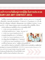 โตโยต้าร่วมแสดงความยินดีกับเยาวชนไทย คว้า 4 รางวัลใหญ่จากญี่ปุ่น ในการประกวด วาดภาพระบายสี TOYOTA DREAM CAR ART CONTEST 2014 ในปีนี้มีเยาวชนส่งผลงานเข้าประกวดรวมทั้งสิ้น 662,000 ผลงาน จาก 75 ประเทศทั่ว โลก ซึ่งแบ่งเป็น 3 รุ่นอายุ คือ รุ่นอายุไม่เกิน 7 ปี รุ่นอายุ 8-11 ปี และรุ่นอายุ 12-15 ปี เพื่อ เข้าชิงรางวัล เหรียญทอง เหรียญเงิน เหรียญทองแดง และรางวัลพิเศษ President Toyota Award อีก 1 รางวัล โดยผลงานของเยาวชนจากประเทศไทย ได้รับรางวัลทั้งสิ้น 4 ชิ้นงาน ส�าหรับรายชื่อของเยาวชนที่ได้รับรางวัลจากประเทศญี่ปุ่น มีดังนี้ 1. รางวัล Gold Award รุ่นระดับอายุ 8-11 ปี ด.ช.จิรวัฒน์ ยอดสิงห์ ผลงาน “ Watpo Massage Car” 2. รางวัล Silver Award รุ่นระดับอายุ 8-11 ปี ด.ช.สุดเลิศ เลิศสุดวิชัย ผลงาน “รถวัวผลิตนม” 3. รางวัล Silver Award รุ่นระดับอายุ 12-15 ปี ด.ช.กตัญญู วัฒนาประดิษฐชัย ผลงาน “รถฝนหลวง” 4. รางวัล Bronze Award รุ่นระดับอายุ 12-15 ปี ด.ช.ศิริโรจน์ โคตรวงษา ผลงาน “รถเพื่อความรักและสันติภาพ” นอกจากเข้ารับรางวัลแล้ว เยาวชนไทยทั้ง 4 ยังได้เข้าร่วมกิจกรรมทัศนศึกษา ชมพิพิธภัณฑ์ อนุสรณ์อุตสาหกรรมและเทคโนโลยีโตโยต้า (TOYOTA Commemorative Museum of In- dustry and Technology) สวนสนุก Mega Web และยัง ได้ร่วมสนุกและเรียนรู้แนวคิดทางด้านเทคโนโลยีต่างๆของ โตโยต้า รวมทั้งกิจกรรมสาระบันเทิงต่างๆ อีกมากมาย