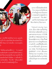 นอกจากนี้บริดจสโตนยังจัด กิจกรรมมอบสิทธิพิเศษ ส�าหรับผู้ลงทะเบียนจอง ยางรถยนต์ จากศูนย์บริการ ยางรถยนต์ “ค็อกพิท” และกิจกรรมร่วมสนุก เกมส์ ชิงรางวัลต่างๆ อีกมากมาย Thailand Industry Expo 2014 เป็นการจัดงานครั้งส�าคัญ เนื่องในโอกาสพิเศษที่กระทรวง อุตสาหกรรม ครบรอบ 72 ปี เพื่อ แสดงศักยภาพของอุตสาหกรรม • โซนที่ 1 “จากต้นน�้า” ส่วนจัดแสดง เรื่องราว ความเป็นมา ประวัติศาสตร์อันยาวนาน และเส้น ทางแห่งความส�าเร็จของ บริดจสโตน ปรัชญาองค์กร ท�าความรู้จักกับกลุ่มบริษัทบริดจสโตนทั่วโลก ไทยและผู้ประกอบการไทย ตั้งแต่ ผู้ประกอบการรายใหญ่ที่ประสบ รวมทั้ง ประเทศไทย นอกจากนี้ยังน�าเสนอกิจกรรมเพื่อสังคมที่ด�าเนินมาอย่างต่อเนื่อง ครอบคลุมใน ความส�าเร็จ และมีชื่อเสียงระดับ ทุกมิติทั้งด้านการศึกษา สังคม สิ่งแวดล้อม และความปลอดภัย นานาชาติไปจนถึง ผู้ประกอบ การ SMEs วิสาหกิจชุมชนและ • โซนที่ 2 “สู่ปลายน�้า” น�าเสนอผ่าน 3 แนวคิด คือ “เพื่อสิ่งแวดล้อมที่ดีกว่า”, “ความพอดี ผู้ผลิตสินค้า OTOP เพื่อแสดง ที่ลงตัว” และ “บริการด้วยคุณภาพที่เหนือกว่า” โดยจัดแสดงผลิตภัณฑ์ยางรถยนต์ทั้งผลิตภัณฑ์ยาง ถึงศักยภาพ ความพร้อม ความ ส�าหรับรถยนต์ส่วนบุคคล และส�าหรับรถยนต์เพื่อการพาณิชย์ ที่ตอบโจทย์ ผู้บริโภคอย่างแท้จริง ทั้ง เป็นหนึ่งเดียวกันที่จะร่วมกันขับ ผลิตภัณฑ์ยางรถยนต์ที่เป็นมิตรกับสิ่งแวดล้อม ECOPIA กลุ่มผลิตภัณฑ์ ไฟร์สโตน “ยางที่ลงตัวกับ ทุกค�าตอบ” รวมถึง กิจกรรมจากศูนย์บริการยาง มาตรฐานบริดจสโตน “ค็อกพิท” เพื่อมอบสิทธิ เคลื่อนให้อุตสาหกรรมไทยเข้ม พิเศษส�าหรับลูกค้าที่ลงทะเบียนจองยาง ผ่านเว็บไซต์ ทันสมัย สอดรับกับไลฟ์สไตล์ผู้บริโภค แข็ง