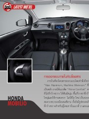 กำรออกแบบภำยในห้องโดยสำร ภายในห้องโดยสารออกแบบโดยค�านึงถึงปรัชญาในการออกแบบของฮอนด้าที่ว่า “Man Maximum, Machine Minimum” ซึ่งให้ความส�าคัญกับผู้ขับขี่และผู้โดยสาร เป็นหลัก ภายใต้แนวคิด “Prime Comfort” ความสะดวกสบายเหนือระดับ ด้วยเบาะ ที่นั่งที่กว้างขวาง ให้สัมผัสนุ่ม พื้นที่วางขาที่กว้างขึ้น และพื้นที่เก็บสัมภาระด้านท้ายที่ HONDA ใหญ่และใช้งานสะดวก โมบิลิโอ ใหม่ เป็นรถยนต์อเนกประสงค์ที่มีพื้นที่ห้องโดยสารที่ MOBILIO สะดวกสบายเหมือนรถซีดาน ทั้งยังมีรูปทรงหลังคาที่ไล่ระดับ ท�าให้มีพื้นที่เหนือศีรษะ ที่กว้างขวางส�าหรับผู้โดยสารในแถวที่ 2 และแถวที่ 3