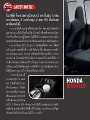 โมบิลิโอ ใหม่ มีเบำะนั่งแบบ 2 แถวในรุ่น S และ เบำะนั่งแบบ 3 แถวในรุ่น V และ RS ซึ่งมีรำย ละเอียดดังนี้ • เบาะนั่งด้านหน้าดีไซน์สปอร์ต โดยพนักพิงหลัง ถูกออกแบบให้เป็นชิ้นเดียวกับพนักพิงศรีษะช่วยโอบ กระชับสรีระของผู้โดยสารได้ดีให้ความสะดวกสบายใน ขณะขับขี่และสะท้อนความเป็นสปอร์ตอย่างเต็มรูปแบบ • เบาะนั่งแถวที่ 2 ในรุ่น S ได้เพิ่มพื้นที่วางขา พื้นที่ บริเวณเข่า และพื้นที่วางเท้าให้มากขึ้น โดยสามารถพับ เบาะนั่งแยกแบบ 60:40 พร้อมพับจังหวะเดียว (One Motion) โดยพนักพิงยังพับราบและปรับเอนได้ถึง 3 ระดับ ส่วนเบาะนั่งแถวที่ 2 ในรุ่น V และ RS ยังสามารถ ปรับเบาะนั่งให้เลื่อนหน้า-หลังได้ถึง 100 มิลลิเมตร ช่วย ให้ผู้โดยสารแถวที่ 3 ขึ้นลงได้สะดวกขึ้น • เบาะนั่งแถวที่ 3 เฉพาะรุ่น V และ HONDA RS ให้พื้นที่วางขา MOBILIO ที่กว้างสบาย ทั้งยัง สามารถพับราบและ พับแยกแบบ 50:50 หรือพับตลบไปด้าน หน้า 2 จังหวะ คือ พับเบาะลงได้เรียบและสามารถพับ ต่อไปด้านหน้าเพื่อให้มีพื้นที่เก็บสัมภาระท้ายมากที่สุด ส่วนพนักพิงยังปรับเอนได้ถึง 2 ระดับ