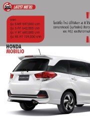 รำคำ รุ่น S MT 597,000 บำท โมบิลิโอ ใหม่ มีให้เลือก 4 สี ได้แก่ สีด�ำคริสตัล (มุก) สีเงิน รุ่น S AT 642,000 บำท อลำบำสเตอร์ (เมทัลลิก) สีขำวออร์คิด (มุก) (เฉพำะรุ่น V รุ่น V AT 682,000 บำท และ RS) และสีขำวทำฟเฟต้ำ (เฉพำะรุ่น S) รุ่น RS AT 739,000 บำท HONDA MOBILIO