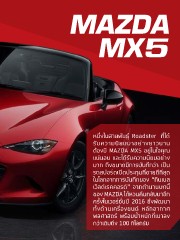 MAZDA MX5 หนึ่งในสายพันธุ์ Roadster ที่ได้ รับความนิยมมาอย่างยาวนาน ต้องมี MAZDA MX5 อยู่ในใจคุณ แน่นอน และได้รับความนิยมอย่าง มาก ถึงขนาดมีการบันทึกว่า เป็น รถสปอร์ตเปิดประทุนที่ขายดีที่สุด ในโลกจากการบันทึกของ “กินเนส เวิลด์เรคคอรด์” จากต�านานบทนี้ ของ MAZDA ได้หวนคืนกลับมาอีก ครั้งในเวอร์ชั่นปี 2016 ซึ่งพัฒนา ทั้งด้านเครื่องยนต์ หลักอากาศ พลศาสตร์ พร้อมน�้าหนักที่เบาลง กว่าเดิมถึง 100 กิโลกรัม