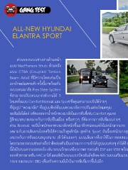 ALL-NEW HYUNDAI ELANTRA SPORT ส่วนของระบบช่วงล่างด้านหน้า แบบ MacPherson Struts ด้านหลัง แบบ CTBA (Coupled Torsion Beam Axle) ที่มีความโดดเด่นเป็น เอกลักษณ์เฉพาะตัว ครั้งนี้มาพร้อมกับ ระบบพวงมาลัย Flex Steer System ที่สามารถปรับระบบการท�างานได้ 3 โหมดทั้งแบบ Comfort Normal และ Sport ซึ่งคุณสามารถปรับได้ง่ายๆ ที่ปุ่มรูป “พวงมาลัย” ที่อยู่บนฟังก์ชั่นบนพวงมาลัยการปรับแต่ละโหมดคุณ จะสัมผัสได้อย่างชัดเจนจากน�้าหนักพวงมาลัยในการขับขี่เช่น Comfort คุณจะ รู้สึกเบาสบายเหมาะกับการขับขี่ในเมือง หรือสาวๆ ที่ต้องการการขับขี่แบบง่ายๆ ส่วน Normal จะมีน�้าหนักของพวงมาลัยหนักขึ้นมาอีกหน่อยแต่ยังไม่หนักมากมาย เหมาะกับการเดินทางไกลหรือใช้ความเร็วสูงสักนิด สุดท้าย Sport อันนี้จะหนักมากสุด เหมาะกับการขับแบบสนุกสนาน เข้าโค้งเยอะๆ แบบเส้นทางที่เราใช้ในการทดสอบครับ โดยรวมของระบบช่วงล่างถือว่าดีคล่องตัวเป็นอย่างมาก การเข้าโค้งรูปแบบต่างๆ ท�าได้ดี นอกจาก นี้ยังมีระบบความปลอดภัย เช่น ระบบรักษาเสถียรภาพการทรงตัว ESP และ VSM พร้อมระบบช่วย ออกตัวทางลาดชัน HAC มาให้ และยังมีระบบเบรกป้องกันล้อล็อค ABS ระบบเสริมแรงเบรก BA ระบบ กระจายแรงเบรก EBD เพื่อสร้างความมั่นใจในการขับขี่มากขึ้นไปอีก