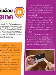 เมื่อหาเจอแล้วสามารถเรียกคืนข้อมูล ผ่าน Wallet ก็ได้ นอกจากนั้นยังสามารถส่ง ปลอดภัยมากกว่าเดิมด้วย มาคืน เรียกได้ว่าความปลอดภัยนั้นมากกว่า ข้อความโชว์หน้าบัตรเพื่อให้คนที่เจอน�าบัตร บัตรเครดิตไฮเทค บัตรเครดิตปกติ บัตรใบนี้ได้รับการสนับสนุนจาก American Express, Bank of America, Chase, Charles Schwab, Citi, US Bank และ Wells Fargo ในอีกไม่กี่ปีข้างหน้า ถ้าระบบการจ่ายเงินด้วยมือถือพร้อมและคน ถ้าใครสนใจสามารถสั่งซื้อได้จากเว็บของ หันมานิยมใช้เมื่อไหร่ ตอนนั้นบัตรเครดิตก็อาจจะไม่จ�าเป็นอีก บริษัทในสนนราคาใบละ $155 หรือประมาณ ต่อไป แต่ตอนนี้มีบริษัทหนึ่งก�าลังมองเห็นโอกาสเพื่อเติมเต็มช่อง 5,000 บาท โดยจะเริ่มขายจริงในหน้าร้อนที่ ว่างของตลาด นั่นจึงเป็นที่มาของ Plastc Card บัตรเครดิตแบบ จะถึงนี้ ไฮเทคที่มาพร้อมระบบสัมผัสจอ E Ink ที่ตั้งเป้าหมายว่าจะน�ามา ส�าหรับใครที่มีความกังวลเรื่องความ ใช้บัตรและคูปองทุกๆ ใบที่อยู่ในกระเป๋าตังของคุณ ปลอดภัยในเรื่องของการท�าธุรกรรมการเงิน ผ่านระบบออนไลน์ วิธีการดังกล่าวก็น่าจะเป็น อีกหนึ่งทางเลือกให้ท่านได้ทดลองใช้งานเพื่อ รองรับไลฟ์สไตล์ในแบบของท่านค่ะ การท�างานของ Plastc นั้นจะเหมือนบัตรเครดิต สามารถใช้ กับเครื่องรูดบัตรทั่วไปได้ แถมยังตั้งค่าให้แสดง QR codes, บาร์ โค้ดหรือข้อมูลอื่นๆ ของบัตรได้เช่นกัน ตัวการ์ดมาพร้อมกับชิพ และฮาร์ดแวร์เกี่ยวกับ PIN นั่นหมายความว่าถ้ามีการอัพเดท เฟิร์มแวร์ก็จะสามารถใช้งานได้ทั่วโลก นอกจากนั้นยังสามารถ เขียนโค้ดเพิ่มเข้าไปให้รองรับ NFC/RFID ได้อีก ในส่วนของความปลอดภัย บัตรจะใช้งานไม่ได้ถ้าไม่ได้เลือก บัตรที่ต้องการใช้ผ่านแอปพลิเคชั่นก่อน นั่นหมายความว่าหัว ขโมยจะใช้งานได้ต้องขโมยทั้งบัตรและเครื่องที่ติดตั้งแอปพลิ เคชั่น แต่ในกรณีที่บัตรหายหรือสงสัยว่ามีใครแอบเอาบัตรไป ใช้รึเปล่าก็สามารถสั่งลบข้อมูลในบัตรจากระยะไกลได้ทันที