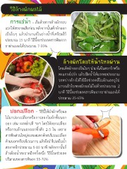 วิธีล้างผักผลไม้ การแช่น�้า – เริ่มด้วยการล้างผักรอบ แรกให้สะอาดเสียก่อน หลังจากนั้นเด็กผักออก เป็นใบๆ แล้วน�ามาแช่ในอ่างน�้าที่เตรียมไว้ ประมาณ 15 นาที วิธีนี้จะช่วยลดสารพิษจาก ยาฆ่าแมลงได้ประมาณ 7-33% ล้างผักโดยให้น�้าไหลผ่าน โดยเด็ดผักออกเป็นใบๆ น�ามาใส่ในตะกร้าหรือ ตะแกรงโปร่ง แล้วเปิดน�้าให้แรงพอประมาณ ระหว่างล้างให้ใช้มือช่วยคลี่ใบผักและถูไป มาบนผิวใบของผักผลไม้ไปด้วยประมาณ 2 นาที วิธีนี้จะช่วยลดสารพิษจากยาฆ่าแมลงได้ ประมาณ 25-63% ปอกเปลือก – วิธีนี้ให้น�าผักหรือผล ไม้มาปอกเปลือกหรือการลอกใบผักชั้นนอก ออก เช่น กะหล�่าปลี ฯลฯ โดยให้ลอกเปลือก หรือกาบด้านนอกออกทิ้งสัก 2-3 ใบ เพราะ สารพิษส่วนใหญ่จะสะสมตกค้างบริเวณเปลือก ด้านนอกหรือบริเวณกาบ แล้วจึงน�าไปแช่ในน�้า สะอาดอีกประมาณ 5-10 นาที หลังจากนั้นก็ ล้างด้วยน�้าสะอาดอีกครั้งหนึ่ง วิธีนี้จะช่วยลด ปริมาณของสารพิษลง 55-70%