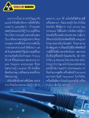 นอกจากนั้นอาจารย์ปริญญายัง แอบอ่าน Line ได้ แม้จะไม่ได้เข้ามาดูที่ แนะน�าให้หลีกเลี่ยงการตั้งพิกัดใน เครื่องของเรา ก็สามารถรู้ว่าโทร.ไปไหน ภาพถ่าย และเสริมว่า “ถ้าจะแชท ไปหาใคร ซึ่งเรียกว่า Cell phone Spy เฟซบุ๊กโดยจะไม่ให้รู้ว่าเราอยู่ที่ไหน Software ใช้ตั้งแต่การจับผิดกรณีชู้สาว ก็ควรปิดการระบุต�าแหน่งด้วยเช่น ไปจนถึงเรื่องระดับประเทศ เช่น กรณีการ กัน ยกตัวอย่างตอนรัฐประหาร ที่ตาม ให้ของก�านัลเป็นโทรศัพท์มือถือ และถูกลง ควบคุมบางคนซึ่งไม่มารายงานตัวนั้น โปรแกรมมาเรียบร้อยแล้ว ก็จะสามารถ การตามหาสามารถท�าได้ง่ายมาก แค่ ล้วงข้อมูลต่างๆ ตั้งแต่เริ่มใช้โทรศัพท์ทันที เข้าไปแชตเฟซบุ๊กก็รู้แล้วว่าอยู่ที่ไหน กรณีนี้เป็นที่มาของคลิปถั่งเช่า เพราะจะ หากจะปิดต้องไปก�าหนด Privacy รู้ไปถึงอยู่ที่ไหนบ้างในแต่ละวัน, ส่ง SMS ให้ off ทั้งในส่วนของ facebook on หาใคร, ดู Website ไหน อ่าน Mail อะไร, และ Program messenger จึงจะ ถ่ายรูป ถ่าย Clip อะไร โปรแกรมโจรต่างๆ ไม่สามารถรู้ Location ได้ ส่วนนี้จะ เหล่านี้ เช่น FlexiSPY, MobiStealth การ ป้องกันอาชญากรที่จะตามรอยหรือรอ ป้องกันแรกสุดคือ เครื่องต้องมี Password จังหวะเราอยู่ เพราะหากไม่มี Password ใครก็หยิบ ภัยใกล้ตัวอีกอย่างคือโดน Hack เครื่องมือถือเราไปลงโปรแกรมได้ เครื่อง line ปัจจุบันบางคนอาจไม่รู้ว่า มีการ iPhone ต้องไม่เจลเบรก