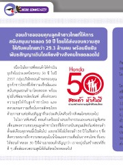 ฮอนด้าขอขอบคุณลูกค้าชาวไทยที่ให้การ ไฮลักซ์ วีโก้ แชมป์ ฉลองยอดขายไฮลักซ์ สนับสนุนมาตลอด 50 ปี โดยได้ส่งมอบความสุข 5 ล้านคันทั่วโลก จัดกิจกรรมคืนความสุข แจกทอง ให้กับคนไทยกว่า 29.3 ล้านคน พร้อมยืนยัน รวมมูลค่ากว่า 50 ล้านบาท พันธสัญญาเติบโตเคียงข้างสังคมไทยตลอดไป นายวุฒิกร สุริยะฉันทนานนท์ ผู้ช่วยกรรมการผู้จัดการใหญ่อาวุโส เปิดเผยถึงการจัด กิจกรรม “ไฮลักซ์ วีโก้ แชมป์ ฉลองยอดขายไฮลักซ์ 5 ล้านคันทั่วโลก คืนความสุข แจกทอง เนื่องในโอกาสที่ฮอนด้าได้ด�าเนิน 50 ล้านบาท” เพื่อเป็นการขอบคุณลูกค้าผู้มีอุปการคุณ และร่วมเฉลิมฉลองความส�าเร็จใน ธุรกิจในประเทศไทยครบ 50 ปี ในปี โอกาสที่รถกระบะ ไฮลักซ์ มียอดจ�าหน่ายสะสมทั่วโลก ครบ 5 ล้านคัน 2557 กลุ่มบริษัทฮอนด้าขอขอบคุณ บริษัท โตโยต้า มอเตอร์ ประเทศไทย จ�ากัด แนะน�ารถกระบะ ไฮลักซ์ วีโก้ ภายใต้ ลูกค้าชาวไทยที่ให้ความเชื่อมั่นและ โครงการ “IMV: Innovative International Multi Purpose Vehicle” ในปี 2547 และ สนับสนุนฮอนด้ามาโดยตลอด พร้อม สร้างปรากฏการณ์ใหม่ให้กับตลาดรถกระบะ 1 ตัน ด้วยการตอบรับอย่างดีจากลูกค้าทั้งใน มุ่งมั่นพัฒนาผลิตภัณฑ์ เพื่อส่งมอบ ประเทศและต่างประเทศ โดยมียอดจ�าหน่ายสะสมภายในประเทศเป็นจ�านวนทั้งสิ้น ความสุขให้กับลูกค้าชาวไทย และ 1,560,554 คัน* ครองอันดับ 1 ในตลาดรถกระบะ 8 ปีซ้อน และมียอดจ�าหน่ายสะสมทั่วโลก ตอบแทนความเชื่อมั่นจากสังคมไทย จาก 172 ประเทศ รวมจ�านวนทั้งสิ้น ด้วยการสานต่อพันธสัญญาที่จะร่วมเติบโตเคียงข้างสังคมไทยตลอดไป 5,174,635 คัน** ถือเป็นรถยนต์ที่ลูกค้า ในโอกาสพิเศษนี้ ฮอนด้าเตรียมน�าเสนอกิจกรรมและแคมเปญพิเศษ ทั่วโลกต่างให้การยอมรับในเรื่องของ เพื่อแสดงความขอบคุณลูกค้าชาวไทยที่ให้การสนับสนุนผลิตภัณฑ์ฮอนด้า สมรรถนะการขับขี่ ความประหยัดน�้ามัน ตั้งแต่เดือนตุลาคมนี้เป็นต้นไป และจะใช้โลโก้ฮอนด้า 50 ปี ในสื่อต่าง ๆ ซึ่ง ประโยชน์ใช้สอย ความทนทาน จนเป็น สื่อความหมายถึง ความขอบคุณในน�้าใจและความเชื่อมั่นจากคนไทย ที่มอบ รถที่ได้รับความนิยมทั้งในประเทศและ ให้ฮอนด้าตลอด 50 ปีที่ผ่านมาฮอนด้าสัญญาว่า เราจะมุ่งมั่นสร้างสรรค์สิ่ง ต่างประเทศทั่วโลก ดี ๆ เพื่อส่งมอบความสุขให้กับสังคมไทยตลอดไป