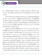 เอา 2 พรีเซ็นเตอร์คู่ฮอต สนุกสนาน อารมณ์ดี ฟรอยด์-เผือก มาสื่อสารผ่านช่อง ทางต่างๆ พร้อมเชิญชวนกลุ่มเป้าหมายทดลองขับที่ผู้แทนจ�าหน่ายรถยนต์ทั่ว ประเทศ” หลังจากที่ประสบความส�าเร็จในการจัดแคมเปญ “ลุ้นเซอร์ไพรส์ไม่สิ้นสุดกับ All New Suzuki CELERIO” ให้กับผู้ที่มาทดลองขับรถมาแล้ว 2 ครั้ง ซูซูกิได้เดิน หน้าจัดกิจกรรมส่งความสุขก่อนสิ้นปีอีก 1 ครั้ง โดยมีรางวัลใหญ่คือ ตั๋วเครื่องบิน ไป-กลับ พร้อมที่พัก และบัตรเข้าร่วมเชียร์ทีมฟุตบอลรอบชิงชนะเลิศของ AFF Suzuki Cup 2014 ให้กับผู้ที่มาทดลองขับรถ All New Suzuki CELERIO ตั้งแต่ วันนี้ จนถึงวันที่ 30 พฤศจิกายน นี้ แคมเปญ “ลุ้นเซอร์ไพรส์ไม่สิ้นสุดกับ All New Suzuki CELERIO” นี้ มอบ โชคให้ผู้เข้าร่วมกิจกรรมทดลองขับรถ All New Suzuki CELERIO รวม 3 ครั้ง รวม มูลค่าของรางวัลนับล้าน โดยครั้งแรกได้มอบ All New Suzuki CELERIO รุ่น GLX มูลค่า 488,000 บาท จ�านวน 2 รางวัล พร้อมประกันภัยชั้นหนึ่ง พ.ร.บ. ค่าจด ทะเบียน และยังมอบบัตรเติมน�้ามันมูลค่า 100,000 บาท ครั้งที่ 2 มอบ All New Suzuki CELERIO รุ่น GLX มูลค่า 488,000บาท พร้อมประกันภัยชั้นหนึ่ง พ.ร.บ. ค่าจดทะเบียน และบัตรเติมน�้ามันมูลค่า 100,000 บาท ให้แก่ นายสังข์ทอง ศรีใส ผู้โชคดีจาก จังหวัดร้อยเอ็ด ทดลองขับที่ บริษัท แหล่งรถร้อยเอ็ด จ�ากัด นอกจาก นี้ยังมอบโชคโทรศัพท์ iPhone 5S 16GB จ�านวน 20 รางวัล ซึ่งผู้โชคดีได้แก่ นาย ก�าพล ทองจุ้ย ทดลองขับที่ บริษัท ซูซูกิ มอเตอร์ (ประเทศไทย) จ�ากัด นายเสนอ เสาใส ทดลองขับที่ บริษัท อารีมิตร ออโต้เซลส์ นางอัมพร ธีรสุวรรณ ทดลองขับ ที่ บริษัท ศรีไฮ่ทงออโตเซลส์ จ�ากัด นายเมธา สนโคกสูง ทดลองขับที่ บริษัท ซูซูกิ