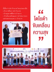 ทั้งสิ้นกว่า 382 ล้านบาท โดยแบ่งออกเป็น • ด้านการศึกษา 229 ล้านบาท • ด้านคุณภาพชีวิต 92 ล้านบาท • ด้านสิ่งแวดล้อมและการด�าเนินการของ องค์กรสาธารณกุศล 61 ล้านบาท โตโยต้า ขับเคลื่อน ความสุข