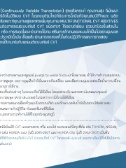น�้ำมัน เกียร์อัตโนมัติแบบ CVT (Continuously Variable Transmission) สูตรสังเครำะห์ คุณภำพสูง ที่พัฒนำ ขึ้นเป็นพิเศษส�ำหรับระบบเกียร์อัตโนมัติแบบ CVT ในรถยนต์รุ่นใหม่ที่ต้องกำรน�้ำมันที่มีคุณสมบัติจ�ำเพำะ ผลิต จำก น�้ำมันหล่อลื่นพื้นฐำนสังเครำะห์คุณภำพสูงและสำรเพิ่มคุณภำพ MULTIFUNCTIONAL CVT ADDITIVES สำมำรถตอบสนองควำมต้องกำรของระบบเกียร์ CVT ชนิดต่ำงๆ ได้อย่ำงดีเยี่ยม ช่วยปกป้องชิ้นส่วนใน ระบบ ป้องกันกำรสั่น หรือ กำรสะดุดในระหว่ำงกำรใช้งำน เสริมกำรท�ำงำนของระบบให้เป็นไปอย่ำงนุ่มนวล มีประสิทธิภำพ และประหยัดน�้ำมัน เชื้อเพลิง ผ่ำนกำรทดสอบทั้งในห้องปฏิบัติกำรและกำรทดสอบ ภำคสนำมโดยกำรใช้งำนจริงกับรถยนต์ระบบเกียร์ CVT ให้ความเสียดทานระหว่างสายพานและพูลเลย์ (metal to metal friction) ที่เหมาะสม ท�าให้การท�างานของระบบ เกียร์ CVT มีประสิทธิภาพสูงสุด ลดการสูญเสียก�าลังในระบบขับเคลื่อน และเพิ่มความนุ่มนวลต่อเนื่องในการเปลี่ยน อัตราทดพูลเลย์ ตลอดอายุการใช้งาน ป้องกันการสึกหรอของชิ้นส่วนต่างๆ ในระบบเกียร์ได้ดีเยี่ยม โดยเฉพาะบริเวณสายพานโลหะและพูลเลย์ ป้องกันการสั่น หรือการสะดุด (Anti-shudder) ในระหว่างการใช้งานได้ดีเยี่ยม ฟิล์มน�้ามันแข็งแรง ทนทานต่อแรงเฉื่อยที่รุนแรงในระบบเกียร์ และรักษาแรงดันน�้ามันในระบบให้เหมาะสม ทนความร้อน และทนต่อการท�าปฏิกิริยากับออกซิเจนที่ดีเยี่ยม ป้องกันการเกิดฟอง และสามารถท�างานได้ดีในทุกช่วงอุณหภูมิ เหมาะส�าหรับระบบเกียร์อัตโนมัติ CVT แบบสายพาน หรือ แบบโซ่ ของรถยนต์นั่งทุกยี่ห้อ เช่น TOYOTA, NISSAN, MITSUBISHI, HONDA (เช่น HONDA Jazz รุ่นปี 2003-2007 และ HONDA City รุ่นปี 2002-2007) เป็นต้น หมายเหตุ : ไม่แนะน�าให้ใช้กับระบบเกียร์ E-CVT (ระบบเกียร์ CVT ในรถยนต์ Hybrid) และควรเลือกใช้ให้เป็นไปตาม มาตรฐานที่ผู้ผลิตรถยนต์แนะน�า