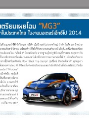 เอ็มจีเตรียมเผยโฉม “MG3” ครั้งแรกในประเทศไทย ในงานมอเตอร์เอ็กซ์โป 2014 บริษัท เอสเอไอซี มอเตอร์-ซีพี จ�ากัด และ บริษัท เอ็มจี เซลส์ (ประเทศไทย) จ�ากัด ผู้ผลิตและจ�าหน่าย รถยนต์ เอ็มจี ยนตรกรรมสัญชาติอังกฤษ เตรียมสร้างสีสันให้กับตลาดรถยนต์ขนาดบี-เซ็กต์เมนต์ในประเทศไทย ส่งน้องใหม่มาแรงประเดิมอวดโฉม “เอ็มจี 3” ที่มาพร้อมกับ มาตรฐานยุโรป รูปลักษณ์ที่สวยงาม สะดุดตา ทัน สมัยสไตล์อังกฤษครั้งแรกในประเทศไทยในงานมอเตอร์ เอ็กซ์โป มหกรรมยานยนต์ครั้งที่ 31 ก้าวเคียงกันยาน ยนต์ อาเซียน นอกจากนี้ยังเตรียมเปิดตัว MG6 ‘Black Top Design’ รุ่นสีใหม่ สีขาวหลังคาด�า สุดหรูหรา สะกดทุกสายตา เพื่อฉลองครบรอบ 90 ปี โดยเริ่มจ�าหน่ายในงานมอเตอร์ เอ็กซ์โป เป็นที่แรก พร้อมโปรโมชั่น ข้อเสนอสุดพิเศษ และโชว์ ‘Trickline’ การแสดงลีลา กีฬาเอ็กซ์ตรีม สุดมันส์ โชว์การทรงตัวบนเส้นเชือกอย่างอิสระ จากยุโรปสุดตื่นตาตื่นใจ มาแสดงให้ แฟนๆ ชาวไทยได้ชมเป็นครั้งแรก พร้อม ด้วยกิจกรรมสนุกๆ อีกมากมาย ณ บูธ เอ็มจี A10 อาคารชาเลนเจอร์ฮอลล์ 3 อิมแพ็ค อารีน่า เมืองทองธานี ตั้งแต่วัน ที่ 29 พฤศจิกายน – 10 ธันวาคม 2557