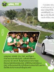 ก�าแพงเพชร-ปตท เสรีไทย ระยะทาง 220.30 กิโลเมตร ซึ่งเป็นช่วงสุดท้าย สลับผู้ขับคนสุดท้าย ช่วงนี้ต้องใช้ ความเร็วประมาณ 110-130 กม./ชม. เพราะมุ่งหน้าเข้ากรุงเทพรถจะเยอะและติดมาก เลยต้องเผื่อเวลาไว้เยอะ หน่อย ในที่สุดก็ถึงปั๊ม ปตท.เสรีไทย จุดหมายปลายทางของเรา เป็นเงิน 129.44 บาท และใช้น�้ามันไป 20 บาท รถคันที่ดีที่สุดใช้ CNG 350.44 บาท ส่วนรถคันที่ใช้ CNG มากที่สุด 415.44 บาท รถทุกคันนั่งกัน 3 คนพร้อม สัมภาระ อัตราสิ้นเปลืองที่ได้นับว่าอยู่ในระดับที่น่าพอใจ เมื่อเปรียบเทียบกับความเร็วที่ใช้ซึ่งใกล้เคียงกับการใช้ งานจริง หรือในบางช่วงใช้ความเร็วมากกว่าคนปกติใช้กันด้วยซ�้า แถมเปิดแอร์ตามปกติอีกต่างหาก บทสรุปของ HONDA City CNG ตอบได้เลยว่า เจ้าแห่งความประหยัดตัวจริง เฉลี่ยแล้วกิโลเมตร ประมาณ 50 สตางค์ ขึ้นอยู่กับสภาพการจราจรและ ลักษณะการขับขี่ของแต่ละบุคคล แต่ที่ส�าคัญการติดตั้งระบบ CNG จากโรงงานฮอนด้านั้น มั่นใจเรื่องความปลอดภัยได้ นอกจาก นี้ยังได้รับประกันจากฮอนด้าเต็มรูปแบบครับ