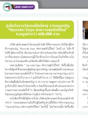 ฮุนไดจับรางวัลมอบโชคใหญ่ จากแคมเปญ “Hyundai Expo ส่งความสุขรับปีใหม่” รวมมูลค่ากว่า 400,000 บาท บริษัท ฮุนได มอเตอร์ (ไทยแลนด์) จ�ากัด ได้จัดงานมอบรางวัลให้แก่ผู้โชค เป็นการขอบคุณลูกค้าที่ให้ความไว้วางใจ เลือกใช้รถยนต์ฮุนได และถือเป็นช่วงเวลาที่ดีที่จะส่งความสุข ดีจากแคมเปญ “Hyundai Expo ส่งความสุขรับปีใหม่” โดยมี มร. โยชิกาซึ ให้ลูกค้าในช่วงเทศกาลปีใหม่ ซึ่งในโอกาสหน้าเรายังคงมุ่งมั่นที่จะสร้างสรรค์กิจกรรมดีๆให้กับลูกค้า โคนิชิ ผู้จัดการทั่วไป เป็นประธานในการจับรางวัลมอบโชค พร้อมได้รับเกียรติ ทั้งในด้านแคมเปญพิเศษหรือสิทธิประโยชน์ต่างๆที่ลูกค้าจะได้รับมากขึ้น เพื่อเป็นการตอบแทนและ จากสื่อมวลชนอาวุโสและแขกผู้มีเกียรติร่วมจับรางวัลและเป็นสักขีพยานใน ขอบคุณในความเชื่อมั่นที่มีให้กับเรามาโดยตลอด” กิจกรรม ณ โรงแรมเอเชีย แอร์พอร์ต (เซียร์รังสิต) จ.ปทุมธานี ส�าหรับรางวัลที่มอบในครั้งนี้มีด้วยกันทั้งสิ้น 4 รางวัล รางวัลที่ 1 คือ บัตรของขวัญจากห้างสรรพ แคมเปญพิเศษ “ Hyundai Expo ส่งความสุขรับปีใหม่” จัดขึ้นเพื่อเปิด สินค้าเซ็นทรัล มูลค่า 100,000 บาท จ�านวน 1 รางวัล รวมมูลค่า 100,000 บาท ผู้โชคดีได้แก่ โอกาสให้ลูกค้าที่จองรถยนต์ฮุนไดทุกรุ่นจากโชว์รูม รถยนต์ฮุนไดทั่วประเทศ และ นัทธภักศรณ์ ธนานิธิวรรธน์ จ.ฉะเชิงเทรา ในงานมหกรรมยานยนต์ครั้งที่ 31 Thailand International Motor Expo 2014 รางวัลที่ 2 คือ บัตรของขวัญจากห้างสรรพสินค้าเซ็นทรัล มูลค่า 50,000 บาท จ�านวน 2 รางวัล ในช่วงระหว่างวันที่ 22 พ.ย 57 จนถึงวันที่ 30 ธ.ค. 57 ได้มีสิทธิ์ในการส่งคูปอง รวมมูลค่า 100,000 บาท ผู้โชคดีได้แก่ อ�านวย บุญฤทธิ์ จ. กรุงเทพฯ และพิสิษฐ์ รุจิรอาภรณ์ ชิงรางวัลเพื่อลุ้นรับบัตรของขวัญกว่า 30 รายการ รวมมูลค่า 400,000 บาท ซึ่ง จ. กรุงเทพฯ ลูกค้าต่างให้การตอบรับกันอย่างดีมาก ส่งผลให้ยอดจองในช่วงก่อนและระหว่าง รางวัลที่ 3 คือ บัตรของขวัญจากห้างสรรพสินค้าเซ็นทรัล มูลค่า 10,000 บาท จ�านวน 10 รางวัล งานมหกรรมยานยนต์ครั้งที่ 31 มียอดเพิ่มสูงขึ้นอย่างต่อเนื่อง และมีลูกค้าเข้า รวมมูลค่า 100,000 บาท และรางวัลที่ 4 คือ บัตรของขวัญจากห้างสรรพสินค้าเซ็นทรัล มูลค่า 5,000 ร่วมแคมเปญส่งคูปองชิงโชคมาร่วมลุ้นรางวัลจ�านวนกว่า 700 ใบ บาท จ�านวน 20 รางวัล รวมมูลค่า 100,000 บาท มร.โยชิกาซึ โคนิชิ ผู้จัดการทั่วไป บริษัท ฮุนได มอเตอร์ (ไทยแลนด์) จ�ากัด โดยของรางวัลจากแคมเปญนี้รวมทั้งสิ้นจ�านวน 33 รางวัล รวมเป็นมูลค่าทั้งสิ้น 400,000 บาท กล่าวว่า “ผมขอแสดงความยินดีกับผู้โชคดีทุกท่านที่ได้รับรางวัลจากแคมเปญ ทั้งนี้ลูกค้าสามารถตรวจสอบรายชื่อผู้โชคดีจากกา
