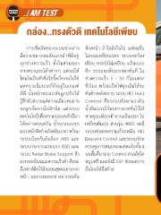 กล่อง..ทรงตัวดี เทคโนโลยีเพียบ การเซ็ตอัพของระบบช่วงล่าง ข้างหน้า ถ้าใกล้เกินไป แต่คนขับ ถือว่าเหมาะสมกับแรงม้าที่มีอยู่ ไม่ยอมเหยียบเบรก ระบบจะร้อง ทุกช่วงความเร็ว ทั้งในส่วนของ เตือน หากยังไม่เหยียบ แป้นเบรก ทางตรงและโค้งต่างๆ แต่จะให้ อีก ระบบจะสั่งเบรกเองทันที ใน โดนใจเป็นตัวซิ่งวัยจิ๊ดก็คงจะไม่ใช่ ช่วงความเร็ว 5 - 30 กิโลเมตร/ แต่ความนิ่มนวลก็ยังอยู่ในเกณฑ์ ชั่วโมง พร้อมเปิดไฟฉุกเฉินให้รถ ที่ดี น�้าหนักพวงมาลัยถูกปรับให้ คันข้างหลังทราบ ระบบ Hill Hold รู้สึกขับสบายแต่ความเฉียบคมอาจ Control คือระบบรักษาแรงดัน จะถูกเจือจางไปสักนิด แต่ระบบ น�้ามันเบรกไว้บนทางลาดชันไว้ให้ เทคโนโลยีเพื่อความปลอดภัยมีมา หากคุณปล่อยเท้าจากแป้นเบรก ไป ให้อย่างครบครัน ทั้งระบบเบรก เหยียบคันเร่ง ส่วนรุ่น 4WD จะมี แบบหน้าดิสก์ หลังดรัมเบรก พร้อม ระบบช่วยลดความเร็วลงเนิน Hill ระบบป้องกันล้อล็อก ABS และ Descent Control และระบบช่วย ระบบกระจายแรงเบรก EBD และ ควบคุมการหมุนของแต่ละล้อทั้ง 4 ระบบ Redar Brake Support สั่ง บนพื้นลื่น Grip Control หากล้อใด เบรกเองในขณะความเร็วต�่า คือจะ หมุนฟรี และยังมี ESP ช่วยลดการ มีเรดาห์ติดไว้ด้านบนสุดของกระจก ลื่นไถลได้อีกด้วย หน้า จะอ่านระยะห่างจากรถคัน