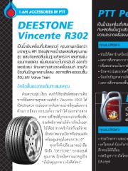 PTT Performa Semi-Synthetic DEESTONE เป็นน�้ำมันเครื่องกึ่งสังเครำะห์ คุณภำพเหนือกว่ำมำตรฐำน API SN ผลิตจำกน�้ำมันหล่อลื่นคุณภำพสูง ผสม Vincente R302 กับหล่อลื่นพิ้นฐำนสังเครำะห์ และสำรเพิ่มคุณภำพพิเศษ เพิ่มสมรรถนะในกำรขับขี่ ออกตัว และเร่งแซง รักษำ ควำมสะอำดเครื่องยนต์ รวมถึงป้องกันปัญหำครำบโคลน ลดกำรสึกหรอของชิ้นส่วน และ Valve Trai เป็นน�้ำมันเครื่องกึ่งสังเครำะห์ คุณภำพเหนือกว่ำ คุณสมบัติพิเศษ มำตรฐำน API SN ผลิตจำกน�้ำมันหล่อลื่นคุณภำพ สูง ผสมกับหล่อลื่นพิ้นฐำนสังเครำะห์ และสำรเพิ่ม • ช่วยให้สตาร์ทเครื่องง่าย คุณภำพพิเศษ เพิ่มสมรรถนะในกำรขับขี่ ออกตัว • ลดการสึกหรอจากการสตาร์ท และเร่งแซง รักษำควำมสะอำดเครื่องยนต์ รวมถึง • เพิ่มสมรรถนะในการขับขี่ ป้องกันปัญหำครำบโคลน ลดกำรสึกหรอของชิ้น • รักษาความสะอาดเครื่องยนต์ ส่วน และ Valve Train • ป้องกันปัญหาคราบโคลน • ลดการสึกหรอของชิ้นส่วนและ Valve Train อีกขีดขั้นของกำรเดินทำงแบบคุณ ด้วยความนุ่ม เงียบ จนท�าให้ทุกสัมผัสของการเดิน PTT Performa ทางที่มีแต่ความสุขอย่างแท้จริง Vincente R302 ได้ เปิดประสบการณ์ของการเดินทางอย่างที่คุณต้องการ ด้วยการยึดเกาะถนนทั้งการเข้าโค้งและทางตรง เป็นผลิตภัณฑ์น�้ำมันหล่อลื่นเครื่องยนต์เบนซิน ชนิดเกรดรวม (Multigrade) SAE ลวดลายดีไซน์ที่ถูกออกแบบเพื่อเพิ่ม 20W-50 คุณภำพตำมมำตรฐำน API SN ผลิตจำกน�้ำมันหล่อลื่นพื้นฐำนคุณภำพสูง ประสิทธิภาพช่วยให้การรีดน�้าออก และสำรเพิ่มคุณภำพพิเศษ ไปได้อย่างรวดเร็ว ไม่หวั่นแม้ว่าจะ คุณสมบัติพิเศษ เป็นสภาพถนนเปียกหรือถนนแห้ง พร้อมดูแลคุณในขนาด15-19” • ช่วยรักษาความสะอาด ทุกครั้งที่เปลี่ยนยางอย่าลืม • เครื่องยนต์ ป้องกันการ นึกถึง “DESTONE” ยางรถยนต์ สึกหรอได้ดีเยี่ยม คุณภาพ อีกหนึ่งความภาคภูมิใจ • ลดปัญหาการเกิดโคลน “มั่นใจคุณภาพ วางใจดีสโตน” (Sludge)