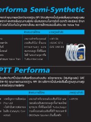 PTT Performa Semi-Synthetic เป็นน�้ำมันเครื่องกึ่งสังเครำะห์ คุณภำพเหนือกว่ำมำตรฐำน API SN ผลิตจำกน�้ำมันหล่อลื่นคุณภำพสูง ผสม กับหล่อลื่นพิ้นฐำนสังเครำะห์ และสำรเพิ่มคุณภำพพิเศษ เพิ่มสมรรถนะในกำรขับขี่ ออกตัว และเร่งแซง รักษำ ควำมสะอำดเครื่องยนต์ รวมถึงป้องกันปัญหำครำบโคลน ลดกำรสึกหรอของชิ้นส่วน และ Valve Trai ลักษณะกำรใช้งำน มำตรฐำนอ้ำงอิง • ช่วยให้สตาร์ทเครื่องง่าย เหมาะส�าหรับรถยนต์ • API SN • ลดการสึกหรอจากการสตาร์ท เบนซินทั่วไป ทั้งแบบ • ILSAC GF-5 • เพิ่มสมรรถนะในการขับขี่ ธรรมดาและ แบบ (SAE 10W-30) • รักษาความสะอาดเครื่องยนต์ สมรรถนะสูง ทั้งที่มีและ • ป้องกันปัญหาคราบโคลน ไม่มี Turbocharger หรือ • ลดการสึกหรอของชิ้นส่วนและ Valve Train Turbo-Intercooler PTT Performa เป็นผลิตภัณฑ์น�้ำมันหล่อลื่นเครื่องยนต์เบนซิน ชนิดเกรดรวม (Multigrade) SAE 20W-50 คุณภำพตำมมำตรฐำน API SN ผลิตจำกน�้ำมันหล่อลื่นพื้นฐำนคุณภำพสูง และสำรเพิ่มคุณภำพพิเศษ ลักษณะกำรใช้งำน มำตรฐำนอ้ำงอิง • ช่วยรักษาความสะอาด • ลดปัญหาการเติมพร่อง เหมาะส�าหรับรถยนต์เบนซินทั่วไป และ • API SN • เครื่องยนต์ ป้องกันการ (Top Up) รถยนต์เบนซินสมรรถนะสูง ทั้งเก่าและใหม่ สึกหรอได้ดีเยี่ยม • ไม่ท�าอันตรายต่อกรอง ทุกขนาด ทั้งที่มีและไม่มี Turbocharger • ลดปัญหาการเกิดโคลน ไอเสีย (Catalytic Con- รวมทั้งรถยนต์เบนซินที่ใช้ก๊าซธรรมชาติ (Sludge) verter) (NGV) และ Gasohol เป็นเชื้อเพลิง