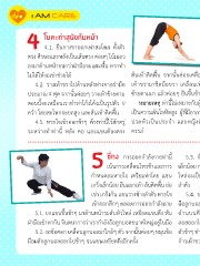 4 โยคะท่าสุนัขก้มหน้า 4.1. ยืนกางขาออกเท่าสะโพก ตั้งตัว ตรง ศีรษะและหลังเป็นเส้นตรง ค่อยๆ โน้มเอว ลงมาด้านหน้าจนกว่าฝ่ามือจะแตะพื้น หากท�า ไม่ได้ให้งอเข่าช่วยได้ ส้นเท้าติดพื้น จากนั้นค่อยเคลื่อน 4.2. วางเท้าขวาไปด้านหลังห่างจากฝ่ามือ เท้าขวามาชิดมือขวา เคลื่อนเท้า ประมาณ 4 ฟุต จากนั้นค่อยๆ วางเท้าซ้ายตาม ซ้ายตามมา แล้วค่อยๆ ยืนขึ้นช้าๆ ตอนนี้จะเหมือนเราท�าท่าโก้งโค้งเป็นรูปตัว V หมายเหตุ ท่านี้ไม่เหมาะกับผู้ที่ คว�่า โดยสะโพกจะยกสูง และส้นเท้าติดพื้น เป็นความดันโลหิตสูง ผู้ที่มีอาการ 4.3. หายใจเข้าออกช้าๆ ค้างท่านี้ไว้สักครู่ ปวดหัวเป็นประจ�า และหญิงตั้ง ระหว่างท�าท่านี้ หลัง คอ และแขนต้องตรง ครรภ์ 5 ชี่กง การออกก�าลังกายท่านี้ 5.3. ก้าวเท้าซ้ายออกไป งอเข่า เน้นการเคลื่อนไหวช้าและการ เล็กน้อย กางแขนขึ้นข้างล�าตัวระดับ ก�าหนดลมหายใจ เตรียมท่าโดย แขน ไหล่จะเป็นรูปตัว T วางแขนลงข้าง เกร็งเล็กน้อย ยืนแยกเท้า ส้นติดพื้น ย่อ ล�าตัว เข่า เกร็งก้น แขนวางข้างล�าตัว หายใจ 5.4. ยกแขนขึ้นมาด้านหน้าและ เข้าออกลึกๆ ตลอดการออกก�าลังกาย ถือลูกบอลอีกครั้ง ยกลูกบอลขึ้นไป 5.1. ยกแขนขึ้นช้าๆ มาด้านหน้าระดับหัวไหล่ เหยียดแขนตึง หัน ด้านบนศีรษะ และปล่อยลูกบอล ฝ่ามือเข้าหากัน จินตนาการว่าเราก�าลังถือลูกบอลขนาดใหญ่อยู่ในมือ ลอยออกไป ค่อยๆวางแขนลงข้างล�า 5.2. งอข้อศอก เคลื่อนลูกบอลมาใกล้ๆ ตัว จากนั้นค่อยๆ หมุนข้อ ตัวช้าๆ ท�าเช่นนี้อีกครั้งแต่เปลี่ยนมา มือผลักลูกบอลออกไปช้าๆ จนแขนเหยียดตึงอีกครั้ง ก้าวเท้าขวาแทน