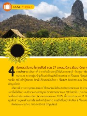 ทุ่งทานตะวัน ณ ไร่คุณท๊อป ซอย 27 ต.หนองบัว อ.พัฒนานิคม จ.ลพบุรี การเดินทาง : เส้นทางที่ 1 จากตัวเมืองลพบุรี ใช้เส้นทาง ลพบุรี – โคกตูม – พัฒนานิคม (ทางหลวง หมายเลข 3017) มุ่งหน้าสู่เขื่อนป่าสักชลสิทธิ์ ระยะทาง 47 กิโลเมตร “ไร่คุณท๊อป” อยู่ทางด้าน ขวามือ (หลังครัวกุ้งหลวง) ก่อนถึงเขื่อนป่าสักเพียง 1 กิโลเมตร ติดต่อสอบถาม โทร. 086-7632418 (ไร่คุณท๊อป) เส้นทางที่ 2 จากกรุงเทพมหานคร ใช้ถนนพหลโยธิน (ทางหลวงหมายเลข 1) ผ่านจังหวัดสระบุรี จากนั้นใช้เส้นทาง อ.ชัยบาดาล-เพชรบูรณ์ (ทางหลวงหมายเลข 21) ขับตรงไป ประมาณ 21 กิโลเมตร พบสี่แยกไปอ�าเภอพัฒนานิคม (ทางหลวงหมายเลข 3017) เลี้ยวขวาประมาณ 17 กิโลเมตร “ไร่ คุณท๊อป” อยู่ทางด้านขวามือ (หลังครัวกุ้งหลวง) ก่อนถึงเขื่อนป่าสักเพียง 1 กิโลเมตร ติดต่อสอบถาม โทร. 086-7632418 (ไร่คุณท๊อป)
