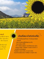 ทุ่งทานตะวัน ณ ไร่คุณท๊อป ซอย 27 ต.หนองบัว อ.พัฒนานิคม จ.ลพบุรี การเดินทาง : เส้นทางที่ 1 จากตัวเมืองลพบุรี ใช้เส้นทาง ลพบุรี – โคกตูม – พัฒนานิคม (ทางหลวง เดือนที่เหมาะส�าหรับท่องเที่ยว หมายเลข 3017) มุ่งหน้าสู่เขื่อนป่าสักชลสิทธิ์ ระยะทาง 47 กิโลเมตร “ไร่คุณท๊อป” อยู่ทางด้าน ระหว่างเดือนพฤศจิกายน ถึง เดือนกุมภาพันธ์ ขวามือ (หลังครัวกุ้งหลวง) ก่อนถึงเขื่อนป่าสักเพียง 1 กิโลเมตร ติดต่อสอบถาม โทร. 086-7632418 ของทุกปี (ไร่คุณท๊อป) สอบถามบริเวณพื้นที่ปลูกทานตะวัน ก่อนการเดินทางได้ที่ : เส้นทางที่ 2 จากกรุงเทพมหานคร ใช้ถนนพหลโยธิน (ทางหลวงหมายเลข 1) ผ่านจังหวัดสระบุรี ททท. ส�านักงานลพบุรี ถ.รอบวัดพระธาตุ อ.เมือง จากนั้นใช้เส้นทาง อ.ชัยบาดาล-เพชรบูรณ์ (ทางหลวงหมายเลข 21) ขับตรงไป ประมาณ 21 กิโลเมตร จ.ลพบุรี 15000 โทรศัพท์ 0-3642-2768 ถึง 9 พบสี่แยกไปอ�าเภอพัฒนานิคม (ทางหลวงหมายเลข 3017) เลี้ยวขวาประมาณ 17 กิโลเมตร “ไร่ เกษตรอ�าเภอเมืองลพบุรี คุณท๊อป” อยู่ทางด้านขวามือ (หลังครัวกุ้งหลวง) ก่อนถึงเขื่อนป่าสักเพียง 1 กิโลเมตร โทรศัพท์ 0-3641-1202, 0-3641-2338 ติดต่อสอบถาม โทร. 086-7632418 (ไร่คุณท๊อป) เกษตรอ�าเภอพัฒนานิคม โทรศัพท์ 0-3649-1133