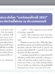 เมอร์เซเดส-เบนซ์ จัดแข่งขันกอล์ฟสมัครเล่นระดับโลก “เมอร์เซเดสโทรฟี่ 2015” เฟ้นหาตัวแทนประเทศไทยลุ้นสิทธิ์ เข้าชิงระดับเวิลด์ไฟนอล ณ ประเทศเยอรมนี บริษัท เมอร์เซเดส-เบนซ์ • รอบที่ 5-7 : วันที่ 6-8 พฤษภำคม ณ สนำม สยำมคัน (ประเทศไทย) จ�ำกัด จัดกำรแข่งขัน ทรี คลับ พัทยำ แพลนเทชั่น กอล์ฟสมัครเล่น “เมอร์เซเดส โทรฟี่ • รอบที่ 8 : วันที่ 15 พฤษภำคม ณ สนำม เรด เมำท์เทน 2015 (MercedesTrophy 2015)” • รอบที่ 9 : วันที่ 22 พฤษภำคม ณ สนำม เชียงใหม่ ไฮ กำรแข่งขันกอล์ฟระดับโลกที่เปิด แลนด์ โอกำสให้เจ้ำของรถยนต์เมอร์เซเดส- ซึ่งในแต่ละสนำมจะแบ่งออกเป็น 4 ดิวิชั่น เพื่อหำผู้ชนะ เบนซ์มีโอกำสก้ำวสู่กำรแข่งขันระดับเวิลด์คลำส เตรียมเปิดสนำมดวล วงสวิงรอบคัดเลือกเข้ำสู่รอบคันทรี่ ไฟนอล แต่ละดิวิชั่นของแต่ละสนำมเข้ำแข่งขันในรอบคันทรี่ไฟนอล ณ เพื่อเฟ้นหำตัวแทนประเทศไทยร่วมชิงชัยในระดับภูมิภำคที่ประเทศออสเตรเลีย และลุ้นสิทธิ์ชิงชัยในรอบเวิลด์ไฟ สนำมบันยัน กอล์ฟ คลับ หัวหิน ในวันที่ 4-5 มิถุนำยน โดย นอล ณ เมืองสตุ๊ทกำร์ท ประเทศเยอรมนี พร้อมเปิดตัว “พรหม มีสวัสดิ์” ซึ่งได้รับกำรสนับสนุนจำกเมอร์เซเดส- สนำมแรกจะเริ่มแข่งขันในวันที่ 9 เมษำยนนี้ ที่ สนำมกอล์ฟ เบนซ์ (ประเทศไทย) ในฐำนะตัวแทนนักกีฬำจำกประเทศไทย ซึ่งเป็นที่คำดหวังว่ำจะสร้ำงผลงำน ให้ประทับใจชำว สยำมคันทรี คลับ พัทยำ แพลนเทชั่น ไทย ในกำรแข่งขันกอล์ฟระดับโลกหลำยรำยกำร ที่จะมำร่วมให้ค�ำแนะน�ำกับผู้เข้ำแข่งขัน “เมอร์เซเดส โทรฟี่ 2015” กำรแข่งขันเมอร์เซเดสโทรฟี่ 2015 ในประเทศไทยครั้งนี้ ตลอดทั้งรำยกำร มีพันธมิตรแบรนด์ชั้นน�ำให้ควำมสนใจให้กำรสนับสนุนกำร เมอร์เซเดสโทรฟี่ 2015 รอบคัดเลือกเริ่มต้นแข่งขันตั้งแต่เดือนเมษำยนถึงเดือนมิถุนำยน 2015 โดยแบ่งออก แข่งขัน อำทิ เทย์เลอร์เมด-อำดิดำส กอล์ฟ (TaylorMade – เป็น 9 สนำมด้วยกัน ได้แก่ Adidas) และ HARNN Global เป็นต้น ส�ำหรับลูกค้ำที่สนใจ • รอบที่ 1-2 : วันที่ 9-10 เมษำยน ณ สนำม สยำมคันทรี คลับ พัทยำ แพลนเทชั่น เข้ำร่วมกำรแข่งขัน สำมำรถติดต่อสอบถำมข้อมูลเพิ่มเติมได้ที่ • รอบที่ 3-4 : วันที่ 23-24 เมษำยน ณ สนำม สยำมคันทรี คลับ พัทยำ แพลนเทชั่น MercedesTrophy Contact Center โทร.02-579-2233