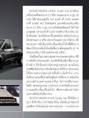 NISSAN NAVARA NP300 Single Cab มาพร้อม เครื่องยนต์ดีเซลขนาด 2.5 ลิตร คอมมอนเรล 4 สูบ 16 วาล์ว ให้ก�าลังแรงสุดถึง 163 แรงม้า ที่ 3,600 รอบต่อ นาที แรงบิด 403 นิวตันเมตร และเครื่องยนต์เบนซิน ขนาด 2.5 ลิตร 4 สูบ ระบบหัวฉีดมัลติพอยท์ ให้ก�าลัง แรงสูงสุด 169 แรงม้าที่ 6,000 รอบต่อนาที แรงบิด 241 นิวตันเมตร โดยทั้งสองเครื่องยนต์ยังมาพร้อมกับระบบ เกียร์ธรรมดา 6 สปีด เหมาะกับทุกสภาพการใช้งาน ทั้ง สมรรถนะการขับขี่และอัตราสิ้นเปลืองน�้ามันที่ได้รับการ พัฒนาให้ประหยัดน�้ามันเพิ่มขึ้นกว่าเดิมสูงสุดถึง 22 % พร้อมรองรับการใช้งานพลังงานทางเลือก นับเป็นครั้งแรกของกลุ่มตลาดกระบะตอนเดียว ที่มี การติดตั้งกล้องมองหลัง และติดตั้งที่เหยียบขึ้นกระบะ ด้านข้าง ให้เป็นอุปกรณ์มาตรฐานทุกรุ่น (ยกเว้นรุ่น แชสซีส์แค็บ) ส่วนภายในห้องโดยสารได้รับการออกแบบ ให้มีความสะดวกสบายด้วยพื้นที่ภายในที่กว้าง เบาะ นั่งที่ออกแบบเพื่อช่วยให้อยู่ในท่านั่งที่สบาย พร้อมกับ อุปกรณ์อ�านวยความสะดวกอื่นๆ ไม่ว่าจะเป็นกระจก ไฟฟ้า ช่องต่ออุปกรณ์ USB/AUX มาตรวัดที่บอกระยะ ทางและอัตราสิ้นเปลืองน�้ามัน เพื่อความผ่อนคลายโดย เฉพาะเมื่อต้องขับขี่ทางไกล NISSAN NAVARA NP300 Single Cab มีให้เลือก 3 รุ่น 3 สี คือ สีขาว ไวท์ โซลิด สีเงิน บริลเลียนท์ ซิลเวอร์ และสีเทา ทไวไลท์เกรย์ ราคา 498,000 – 516,000 บาท