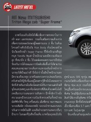 All New MITSUBISHI Triton Mega cab “Super Frame” มาพร้อมแค็บเปิดได้เพื่อเพิ่มความสะดวกในการ เข้า-ออก และขนของ รวมทั้งเสริมความแข็งแกร่ง เพื่อความปลอดภัยของผู้โดยสารแบบ 2 ชั้น ในด้วย โครงสร้างตัวถังนิรภัย Rise Body ด้วยโครงสร้าง นิรภัยเหล็กกล้า Super Frame ที่ใช้เหล็กแรงดึงสูง High Tensile Steel น�้าหนักเบาและมีความแข็งแรง สูง ที่หนาถึง 2 ชั้น ไร้รอยต่อตลอดความยาวจึงช่วย ป้องกันการโค้งงอและการบิดตัวเพิ่มขึ้นท�าให้สามารถ ตอบสนองทุกสภาวะเส้นทางและรองรับน�้าหนักการ บรรทุกได้เป็นอย่างดี ยิ่งไปกว่านั้นยังน�้าหนักเบาและ มีความแข็งแรงสูง มาพร้อมระบบความปลอดภัยครบ คู่หน้าแบบ SRS ทุกรุ่น สะดวกสบายในการขับขี่ด้วย ครันช่วยให้ผู้ขับขี่และผู้โดยสารรู้สึกมั่นใจตลอดการ กระจกไฟฟ้า เครื่องปรับอากาศ เครื่องเล่นวิทยุ ซีดี เอ็ม ขับขี่ ส�าหรับภายในห้องโดยสารได้รับการตกแต่งด้วยสี พีสาม ช่อง AUX รวมทั้งมีการออกแบบกระบะท้ายที่ ทูโทนสปอตหรู และห้องโดยสารที่เงียบด้วยเทคโนโลยี ใหญ่ขึ้นพร้อมผนังกระบะแบบสองชั้น ขอบกระบะหนา ลดเสียงรบกวนตลอดการเดินทาง อีกทั้งยังกว้างนั่ง พิเศษ โดยมีซุ้มล้อขนาดเล็กเพื่อเพิ่มพื้นที่การบรรทุก สบายและมีระบบความบันเทิงครบครันทั้งหน้าจอ สินค้าได้มากเป็นพิเศษ ท�าให้คุ้มค่าทุกการเดินทางและ มัลติฟังก์ชั่น วิทยุ เครื่องเล่น เอ็มพีสาม จอภาพแบบ งานบรรทุก อีกทั้งยังคล่องตัวในทุกการขับขี่ด้วยรัศมีวง ระบบสัมผัส กล้องมองหลัง ระบบน�าทางและระบบ เลี้ยวที่แคบเพียง 5.7 เมตร ในรุ่นขับเคลื่อน 2 ล้อ และ ปรับอากาศอัตโนมัติ และสิ่งอ�านวยความสะดวกอื่นๆ 5.9 เมตร ในรุ่นยกสูง อีกมาก ในขณะที่รุ่นซิงเกิ้ลแค็บ มาพร้อมถุงลมนิรภัย ขับเคลื่อนด้วยขุมพลังจากเครื่องยนต์ดีเซลที่ให้
